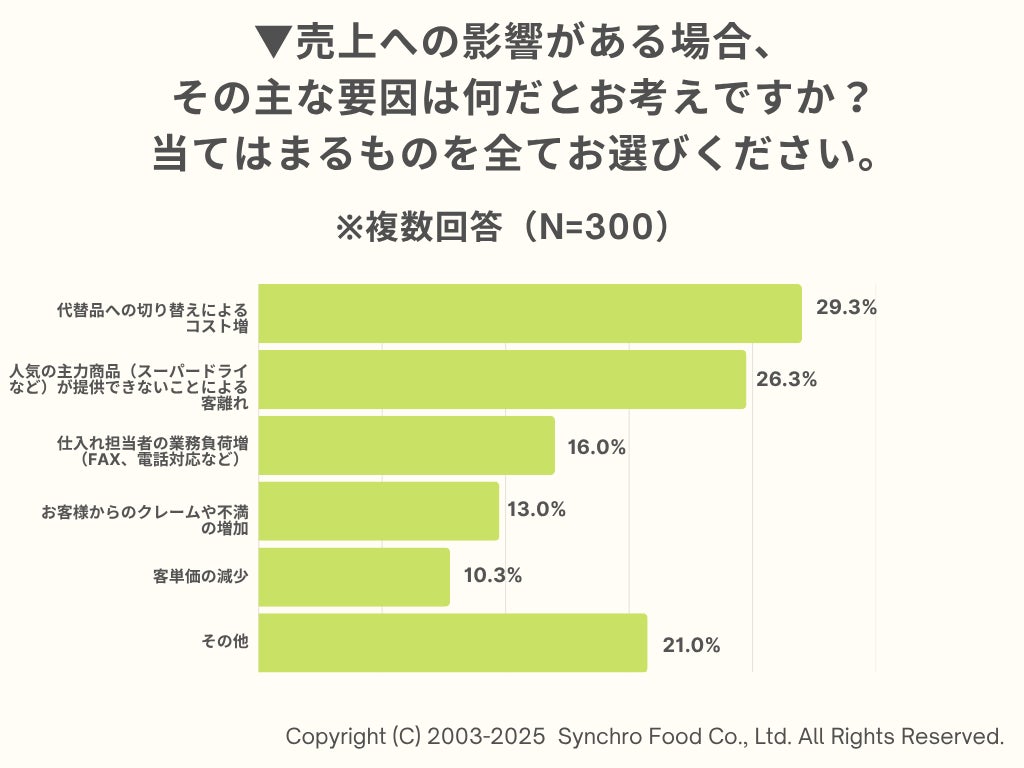 一方で、売上への影響要因について聞いたところ、「代替品への切り替えによるコスト増」(29.3%)が最多に。次いで「人気の主力商品(スーパードライなど)が提供できないことによる客離れ」(26.3%)と続きます。