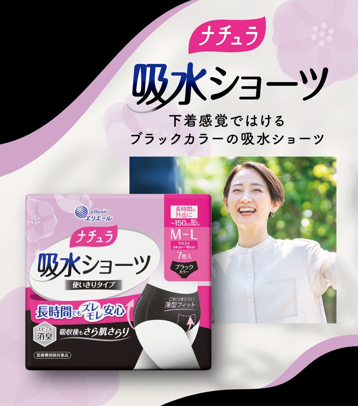 そこで、吸水ケアブランド「ナチュラ」では、見た目のオムツっぽさを払拭し、気軽に交換できる使い切りタイプの「ナチュラ 吸水ショーツ」を新たに発売します。ズレにくいショーツ型と優れた吸収力・消臭機能で長時間のお出かけ時にも安心してご使用いただけます。