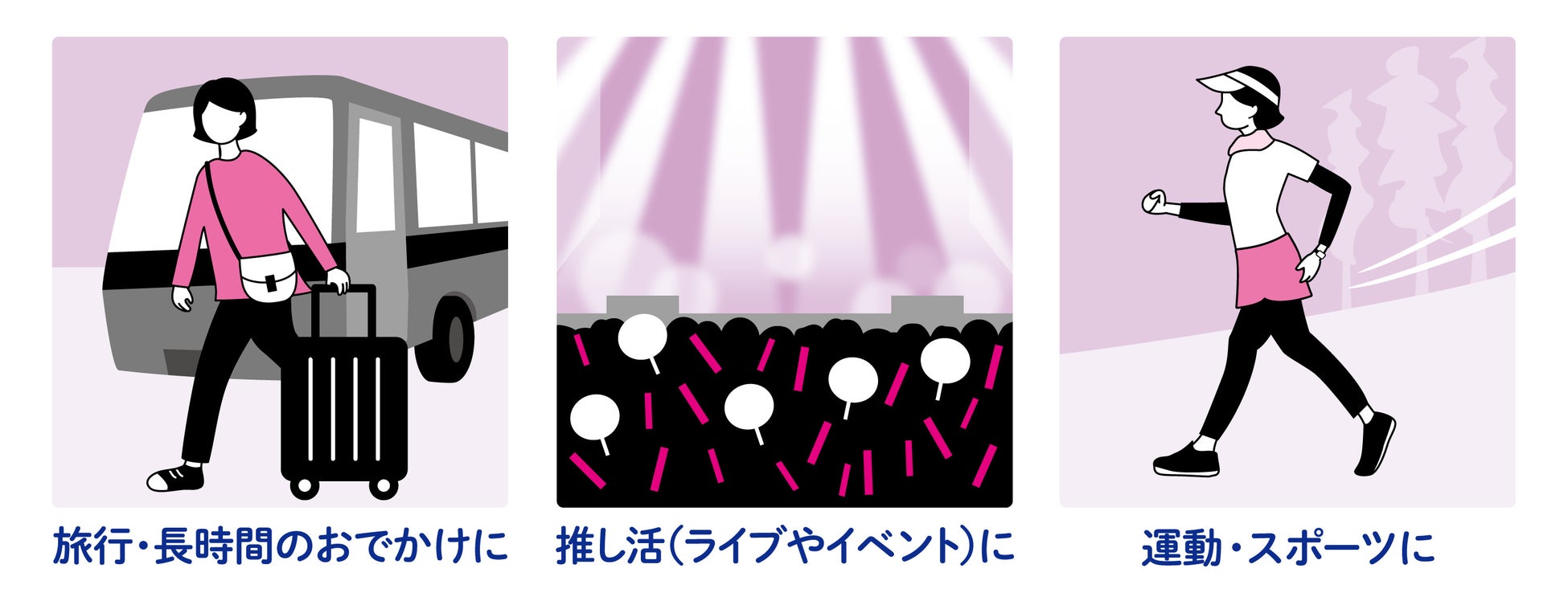 ・長時間の外出はもちろん、アクティブに動くスポーツシーンなど、さまざまなシーンでお使いいただけます。