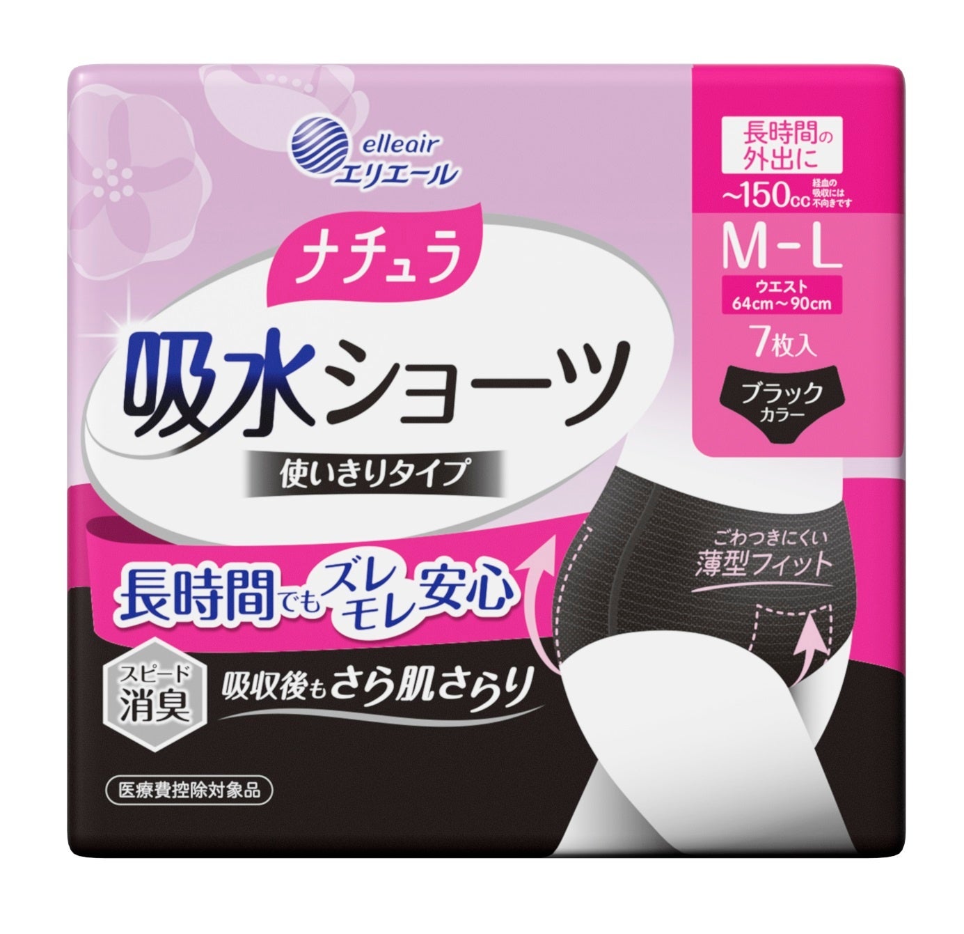 ナチュラブランド初の「ナチュラ 吸水ショーツ」は、長時間の外出でもズレ・モレ安心なショーツタイプの吸水ケア用品です。見た目のオムツっぽさを払拭し、ふだんの下着のように着用できるよう、スタイリッシュなブラックカラーを採用しています。また、機能面ではヒップラインにもひびきにくい薄型吸収体の採用でごわつきにくさを実現しました。薄型でありながら、たっぷりポリマー配合で優れた吸収力とスピード消臭機能を発揮し、ニオイも安心です。吸収後もさらっとした肌ざわりを保ちます。そして、気軽に使える使い切りタイプで、持ち運びや捨てるときにも気にならない便利な個包装です。