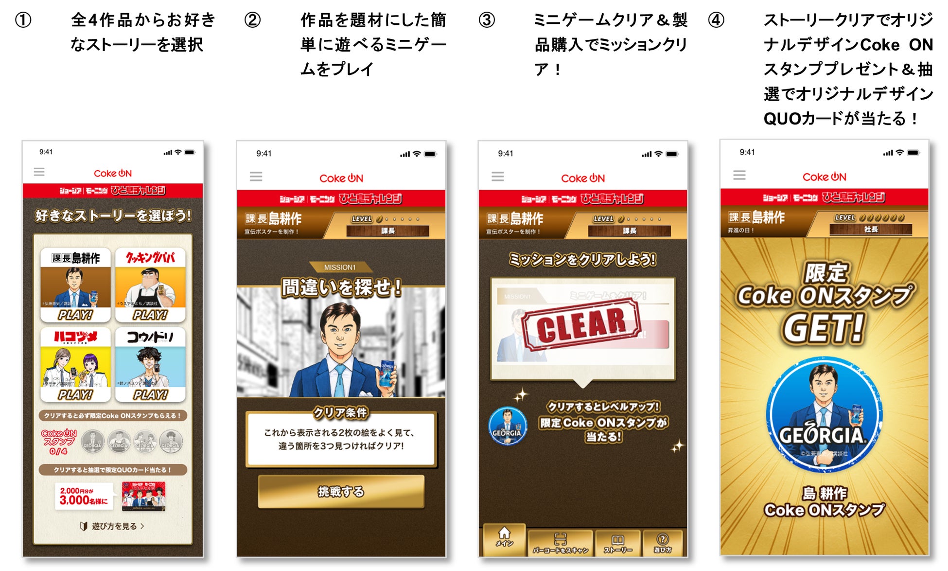 コカ・コーラ公式スマートフォンアプリCoke ONで展開される「ジョージア ひと息チャレンジ」は、5分から10分で手軽に楽しむことができ、ちょっとした休憩や気分転換など、ひと息つく時間に最適なミニゲームです。ミッションクリアでレベルアップを繰り返し、ストーリーをクリアすると、オリジナルデザインCoke ONスタンプをプレゼント。さらにオリジナルデザインQUOカードが当たるプレゼントキャンペーンに応募することができます。