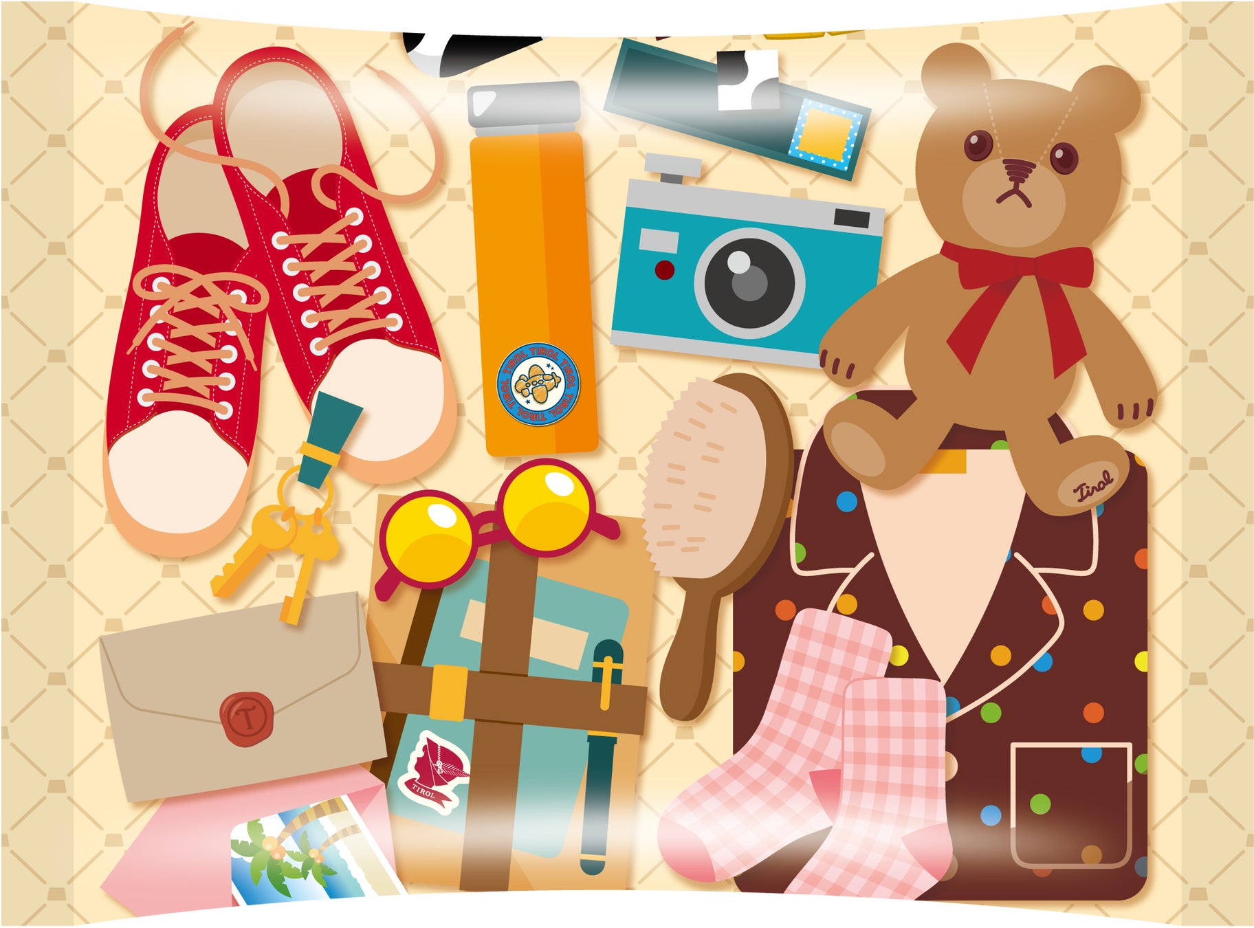 カメラやパジャマなどの旅行の必需品や、写真やお土産など旅の持ち物風のにぎやかなデザイン!