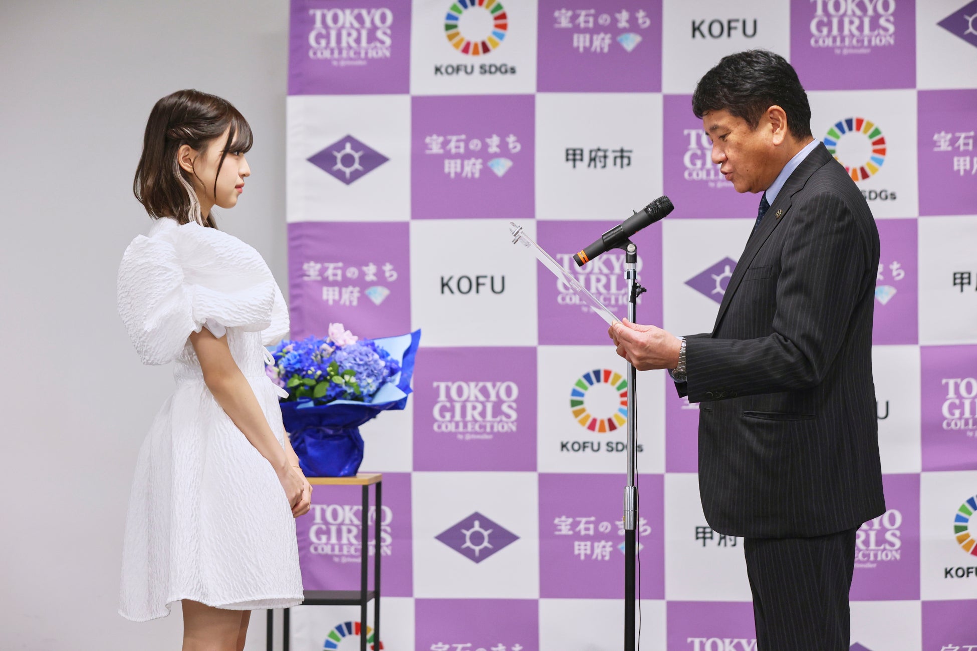 東京ガールズコレクション実⾏委員会(企画/制作:株式会社 W TOKYO)は、「宝石のまち甲府」を世界に向けて発信することを目的に、甲府市と協働し『甲府ジュエリー×TGCプロジェクト』を発足、今年で3年目となりました。この度、新たな取り組みとして当プロジェクトのアンバサダーに、山梨県在住の現役女子高生で、SNS総フォロワー数480万人超えを誇るティーンのカリスマMINAMIの起用が決定しました。起用に際し、7月17日(水)に甲府市役所にて記者発表会のなかで委嘱状を授与されました。