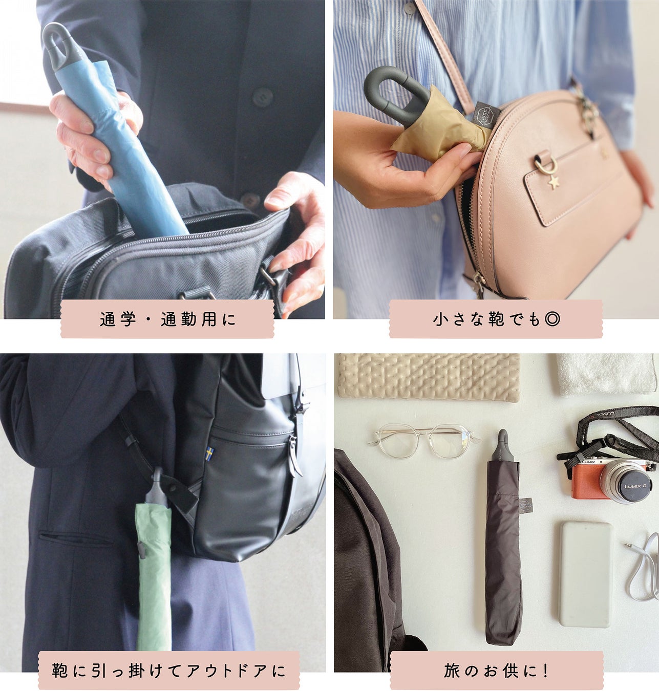 小さくて軽い持ち運びに便利な「雨晴兼用 フック付き軽量折りたたみ傘」は、なんとスマートフォンより軽い驚きの108g!持ち運んでいることを忘れてしまいそうなほどの軽さとスリムなデザイン。さらに傘本体にカラビナがついているので、好きな所に取り付ける事ができます。バッグの中でも場所をとらず邪魔にならないから、持ち運びにストレスを感じさせません。折りたたみなのに広げると直径が大きいのも特長です。また、日傘としても使えるUVカット機能や強風でも壊れにくい骨を使用するなど機能にもこだわりました。
