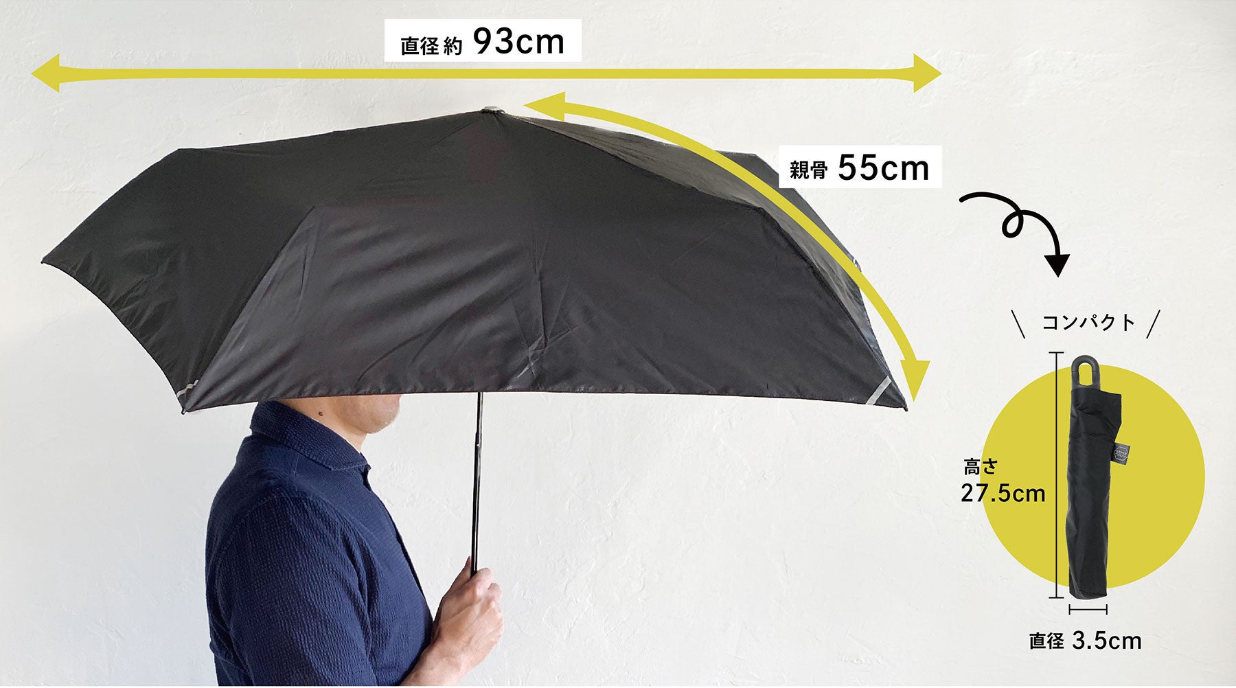 男性でもすっぽり肩が収まるよう折りたたみの中でも大きめの直径約93cm。雨よけに十分なサイズ感なのに収納時は直径3.5cmと驚きのスリムボディです。