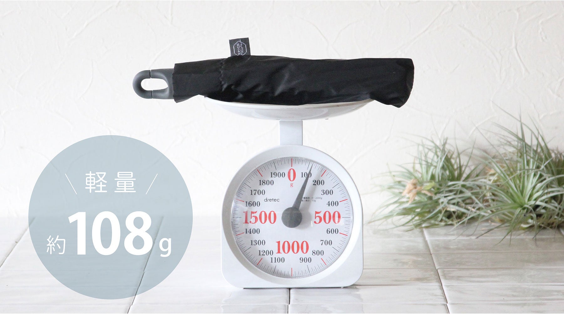 スマートフォンより軽い約108g。傘生地は透け感のあるタイツに使われるほどの糸の太さである、20デニールのポリエステルを使用。傘骨は軽くて丈夫なカーボンファイバー骨を採用し、強度を持ちながら軽量化を追求しました。