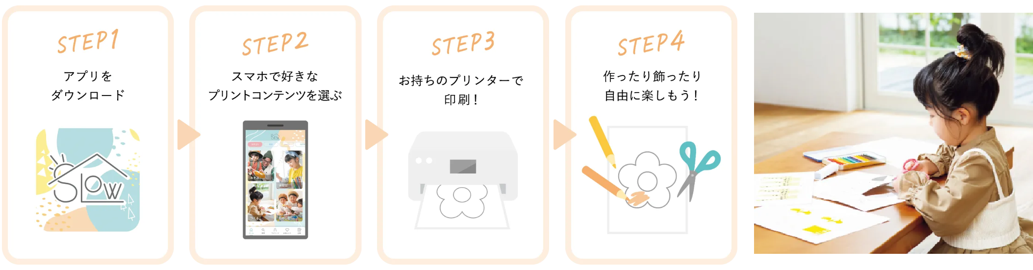 スマホアプリ「SLOW(刷ろう)」は、子育てに役立つ季節の装飾やおうち遊び・知育教材など、1500種類以上のプリントコンテンツが印刷できる無料サービスである。スマホにアプリをダウンロードするだけで、「あそぶ」「まなぶ」「つくる」「たのしむ」の4つのカテゴリーから、好きなコンテンツを選んで、お持ちのプリンターから印刷できる。