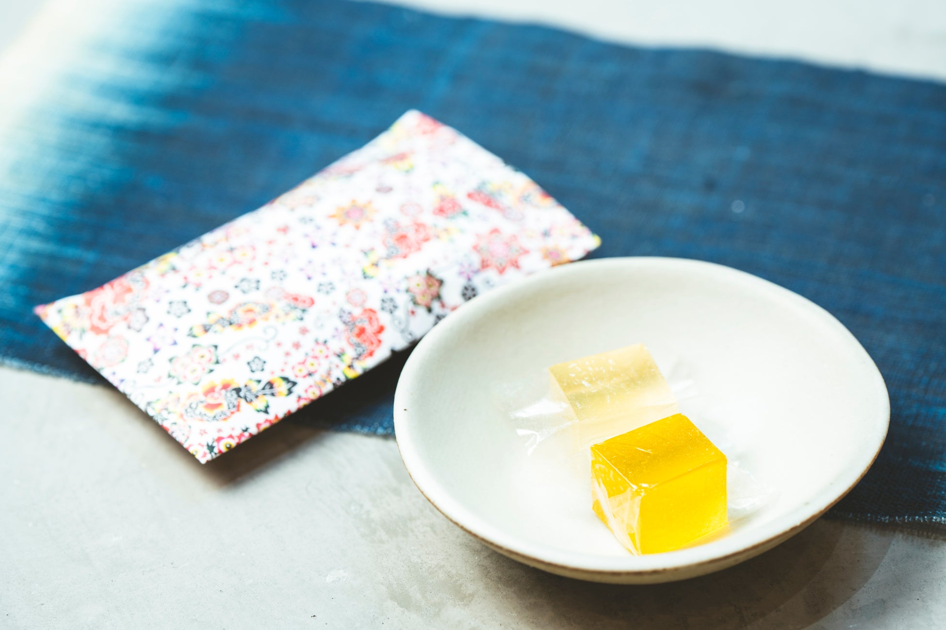 沖縄果実のピューレをふんだんに使った、寒天ベースのフルーツゼリー「琥珀果(マンゴー・パッションフルーツの2種)」を、3,000円(税込)以上お買い上げのお客様に、DearOkinawa,限定のポチ袋に入れてお渡しします。「琥珀果」は果実を4日間かけて職人が一つずつじっくり手作りした、人口甘味料・保存料、着色料不使用のフルーツゼリーです。琥珀のような澄んだ色が特徴で、噛み締めた瞬間、果実そのものから抽出された自然な甘味が口の中に広がる人気商品です。