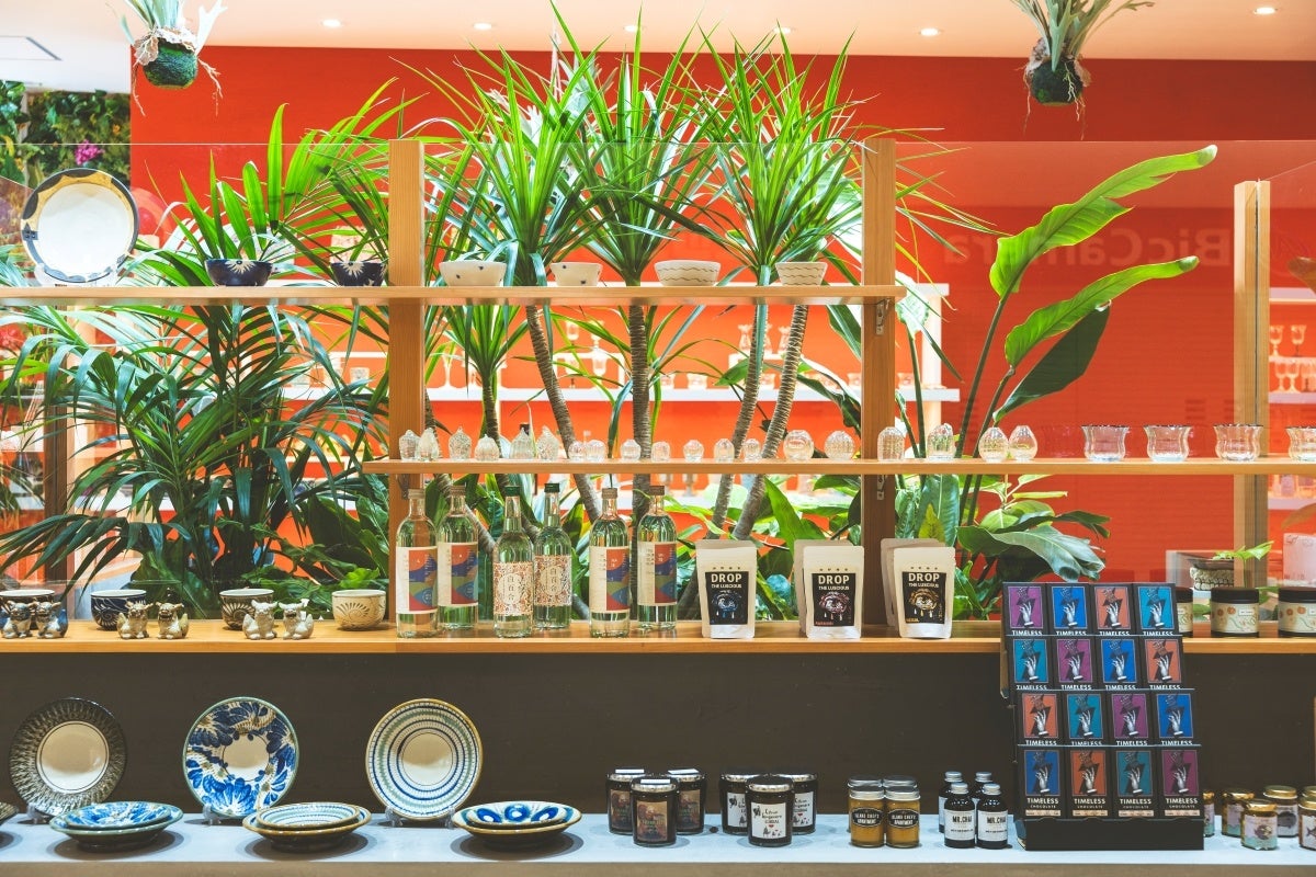 店内中央には、グリーンコーディネーター新城圭吾氏(PLANTADOR)監修による、オオタニワタリなど沖縄らしい観葉植物の生木を植えた箱庭を配置し、沖縄ならではの多様で豊かな自然を表現しています。さらに、箱庭を囲むように配置された商品棚には、草花や海をモチーフにしたやちむんや琉球ガラスなどをはじめとする、沖縄の自然と深い結びつきを持つ工芸品がディスプレイされています。