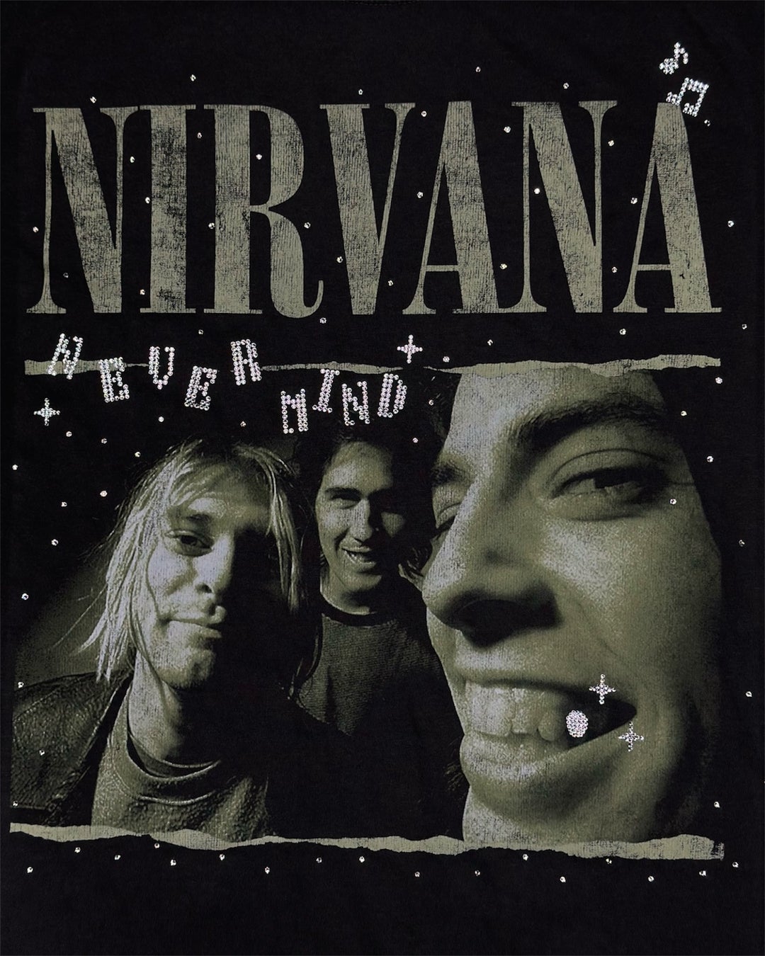 「NIRVANA(ニルヴァーナ)」のTシャツが持つ大胆なデザインや存在感はそのままに、今回は「Nevermind」の世界観を軸にスワロフスキーの繊細な輝きをプラス。ヴィンテージ感のある風合いにラグジュアリーな要素が重なり、プリンチペプリヴェらしい唯一無二のスタイルが完成しています。