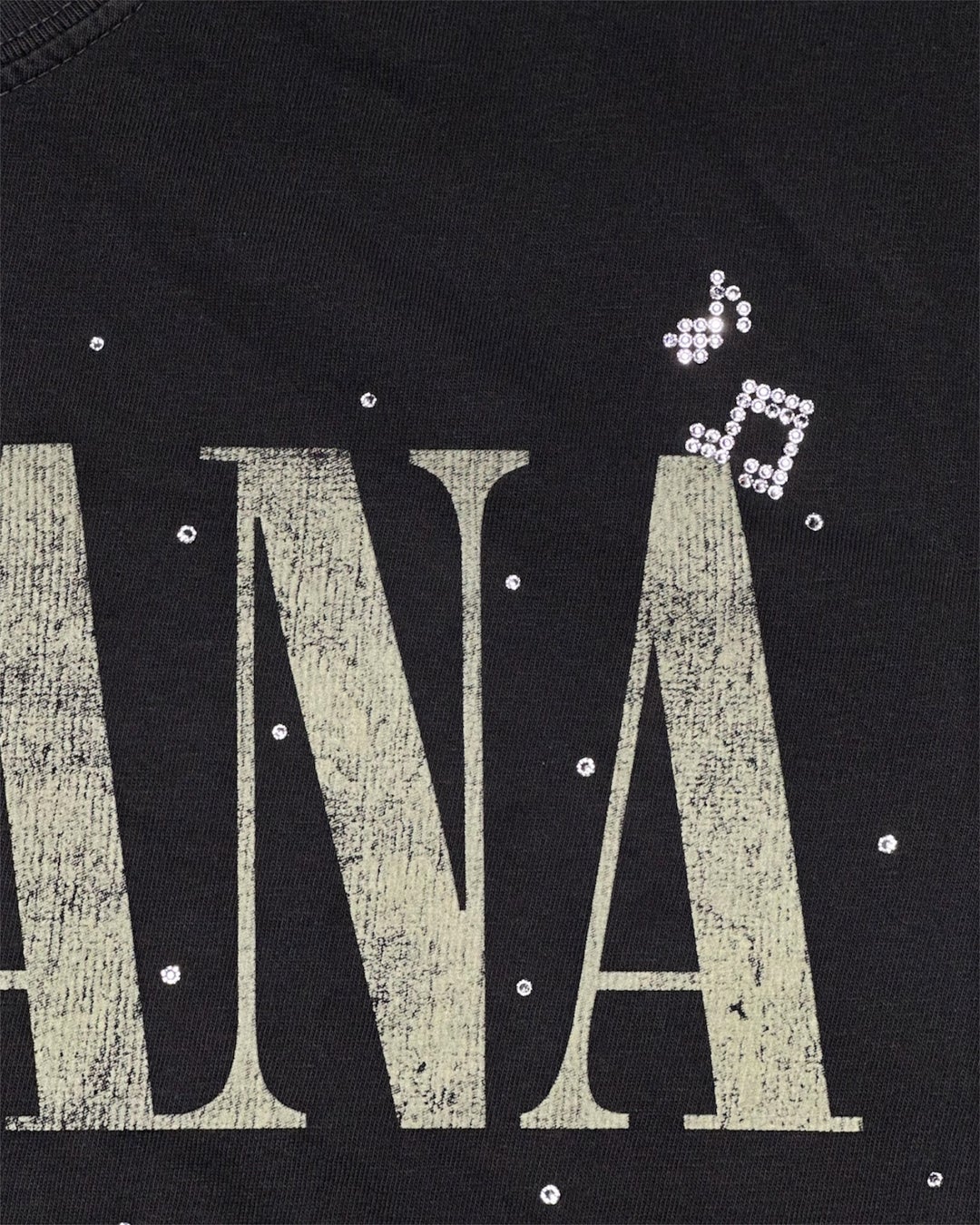 今作の注目は、フロントにあしらわれた「Nevermind」の文字。手作業で一粒ずつ丁寧に配置されたスワロフスキーが、荒々しいグランジの雰囲気に上品なアクセントを加えています。