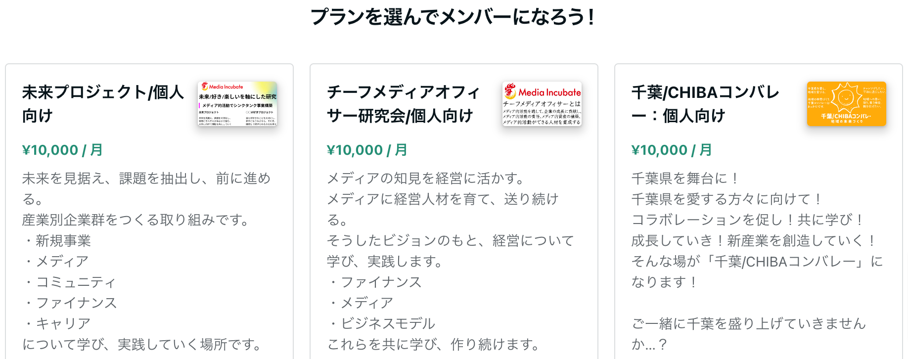 「未来プロジェクト」「チーフメディアオフィサー研究会」「千葉/CHIBAコンバレー」がにて月額サービスを開始いたしました。クローズドコミュニティやイベントにご招待いたします。個人が1万円、法人は5万円になっています。https://prtimes.jp/main/html/rd/p/000000691.000018590.html