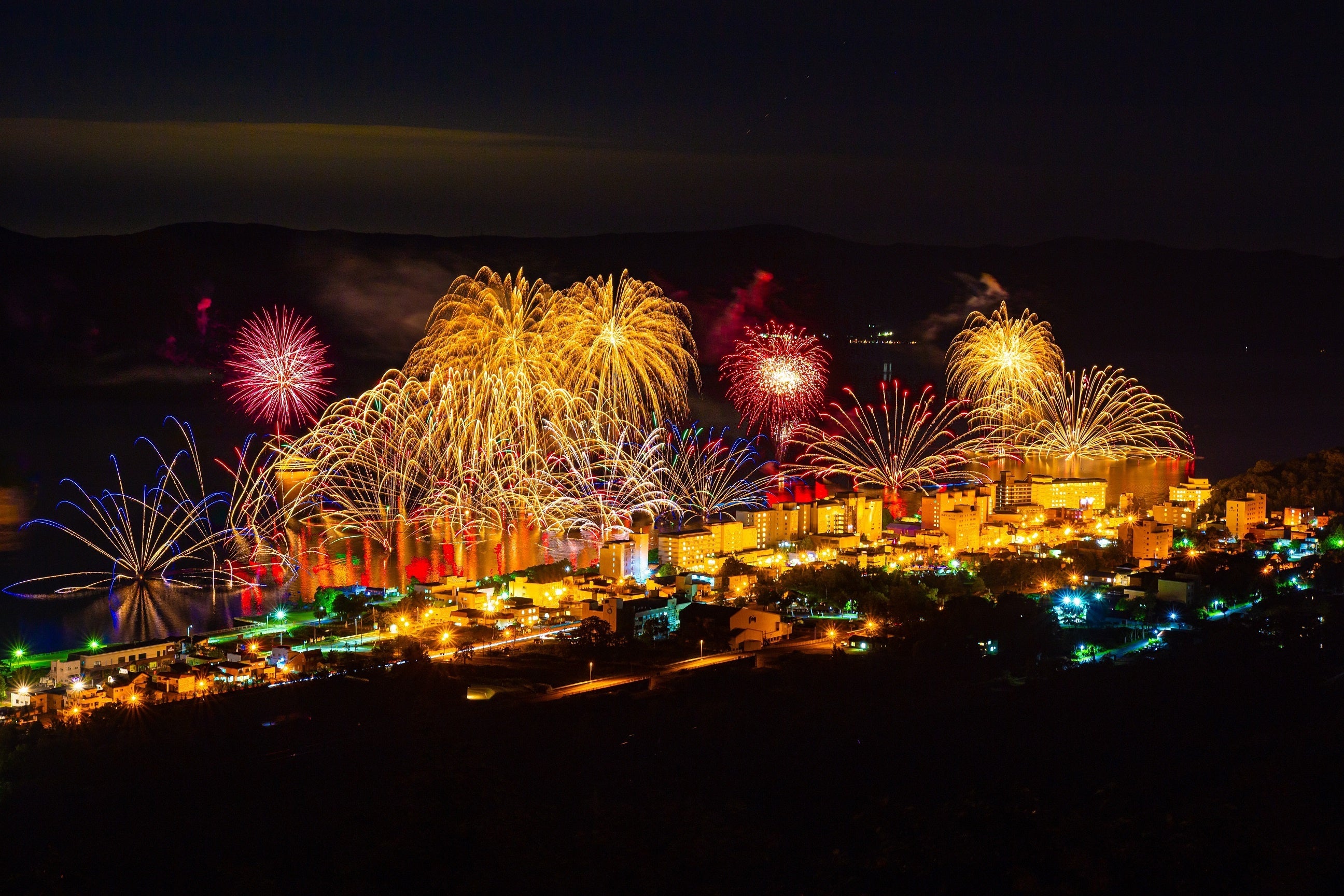 また、市内では年間を通してイベントが⾏われており、開催100回超の歴史を持つ温泉まつりをはじめ、⾳楽祭や、夏・冬でそれぞれ異なる趣をもつ花⽕⼤会などが楽しめます。