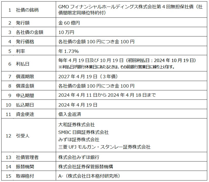 GMOインターネットグループのGMOフィナンシャルホールディングス株式会社(本社:東京都渋谷区、代表執行役社長 COO:石村 富隆)は、本日、第4回無担保社債(社債間限定同順位特約付)の発行について決定しましたので、お知らせいたします。