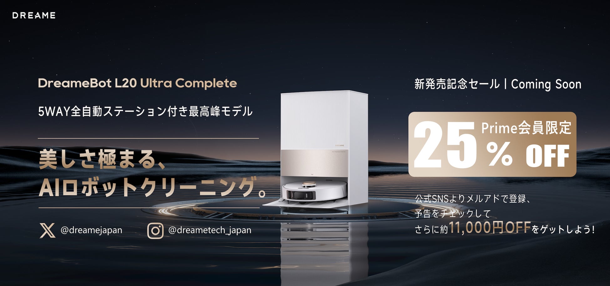 さらに、新製品の発売を記念して、発売日より、「DreameBot L20 Ultra Complete発売記念セール」を実施いたします。Amazonプライム会員に向けて、対象製品のL20 Ultra Completeがクーポン適用後に25%OFFとなる特別価格で販売します。さらに、L20 Ultra Complete特集ページ( https://www.dreametech.jp/products/l20ultra-presale )にて、約11,000円OFFクーポンをプレゼントします!