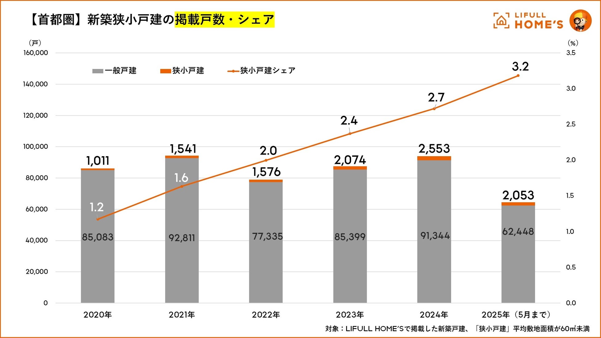 首都圏の新築「狭小戸建」掲載戸数・シェアをLIFULL HOME'Sが調査