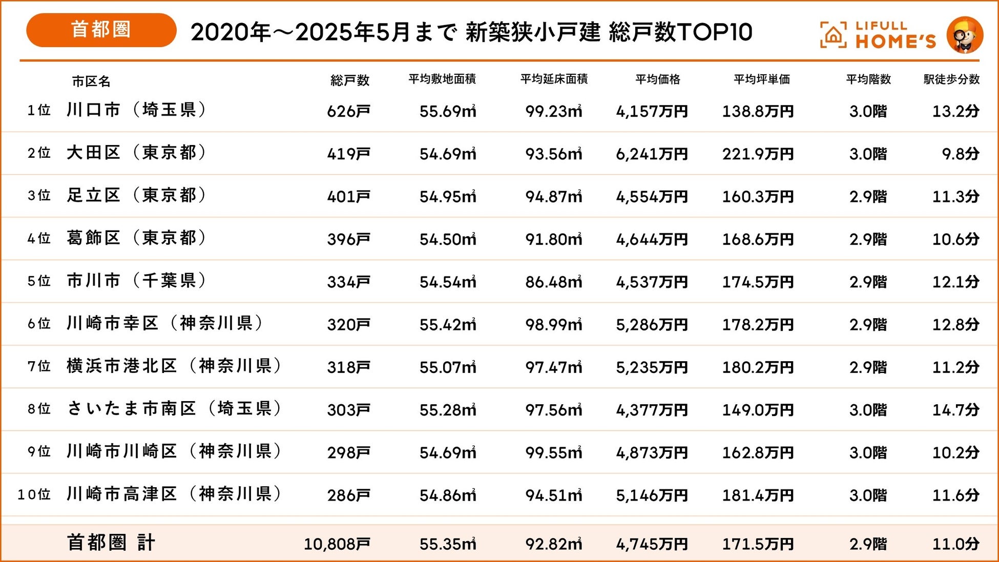 街別の総戸数TOP10:狭小戸建が多いエリアは都内へアクセスしやすく坪単価が100万円台