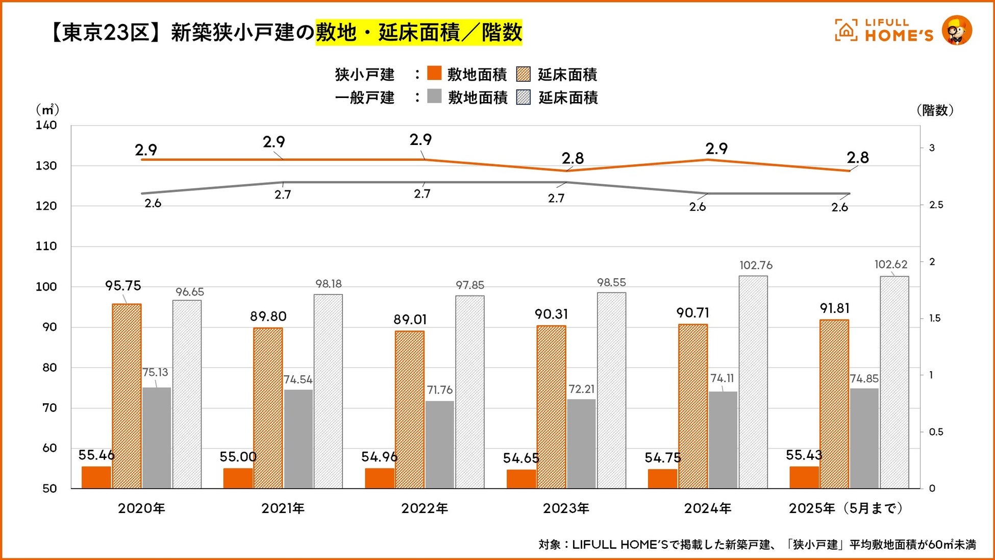 2020年以降、物件価格が上昇している東京23区において狭小戸建の敷地面積は平均55㎡前後で安定して推移する一方、延床面積は90㎡前後を維持しています。これは高さを重視して(平均階数2.9階)、居住スペースを確保できているためです。これに対して、一般戸建の敷地面積は70〜75㎡台、延床面積は約100㎡前後で推移し、階数は2.6〜2.7階と狭小戸建よりもやや低めです。