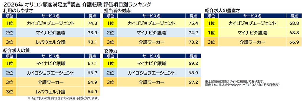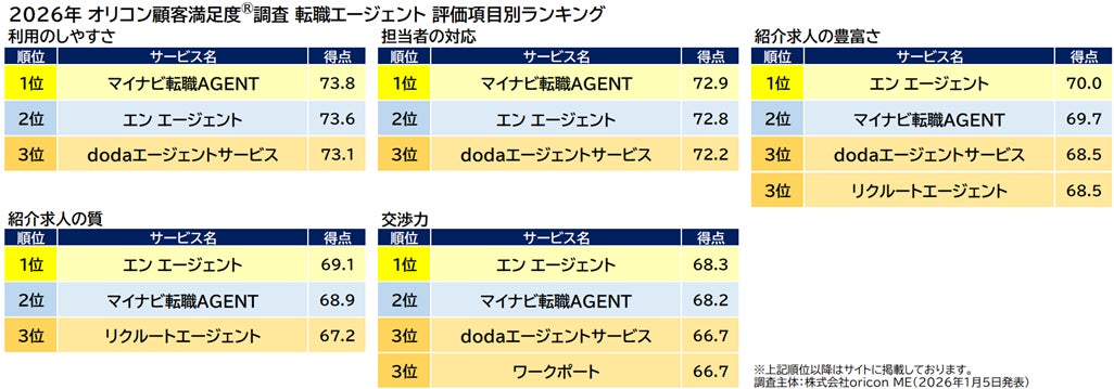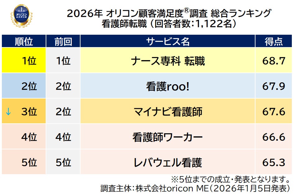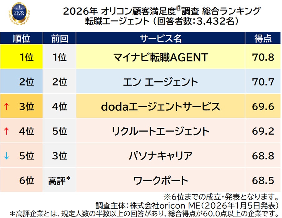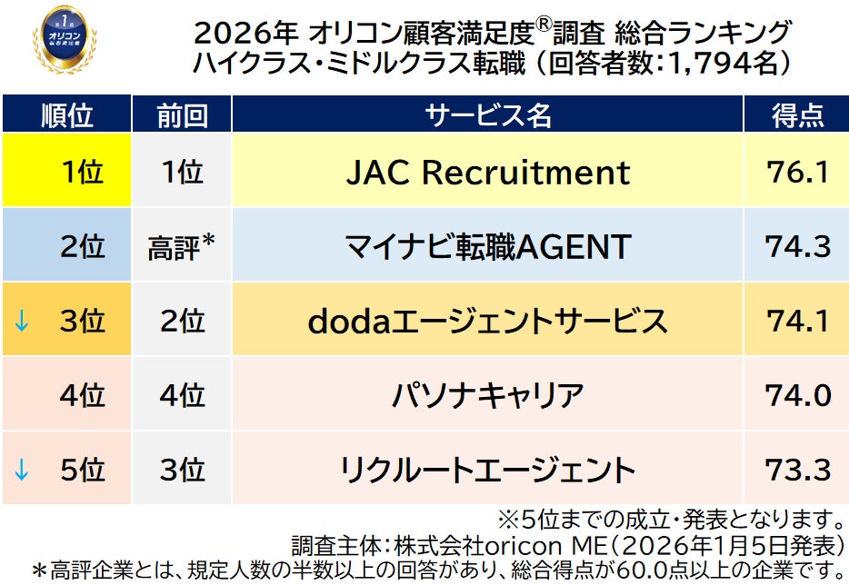 オリコン株式会社(本社:東京都港区 代表取締役社長:小池 恒、略称:オリコン)は、グループ会社である株式会社oricon MEが、実際のサービス利用者を対象に第三者の立場で実施した『転職エージェント』『ハイクラス・ミドルクラス転職』『看護師転職』『介護転職』についての顧客満足度調査の結果を、2026年1月5日(月)14時に「オリコン顧客満足度®」公式サイト内にて発表いたしました。ランキングは以下の通りとなりました。