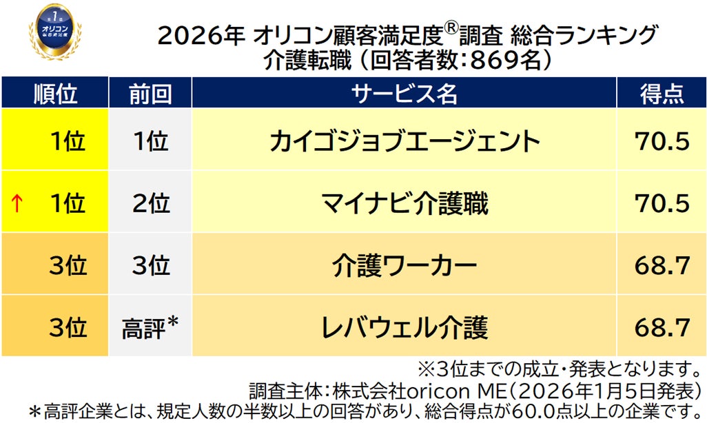 ■【カイゴジョブエージェント】と【マイナビ介護職】が同点で総合1位に