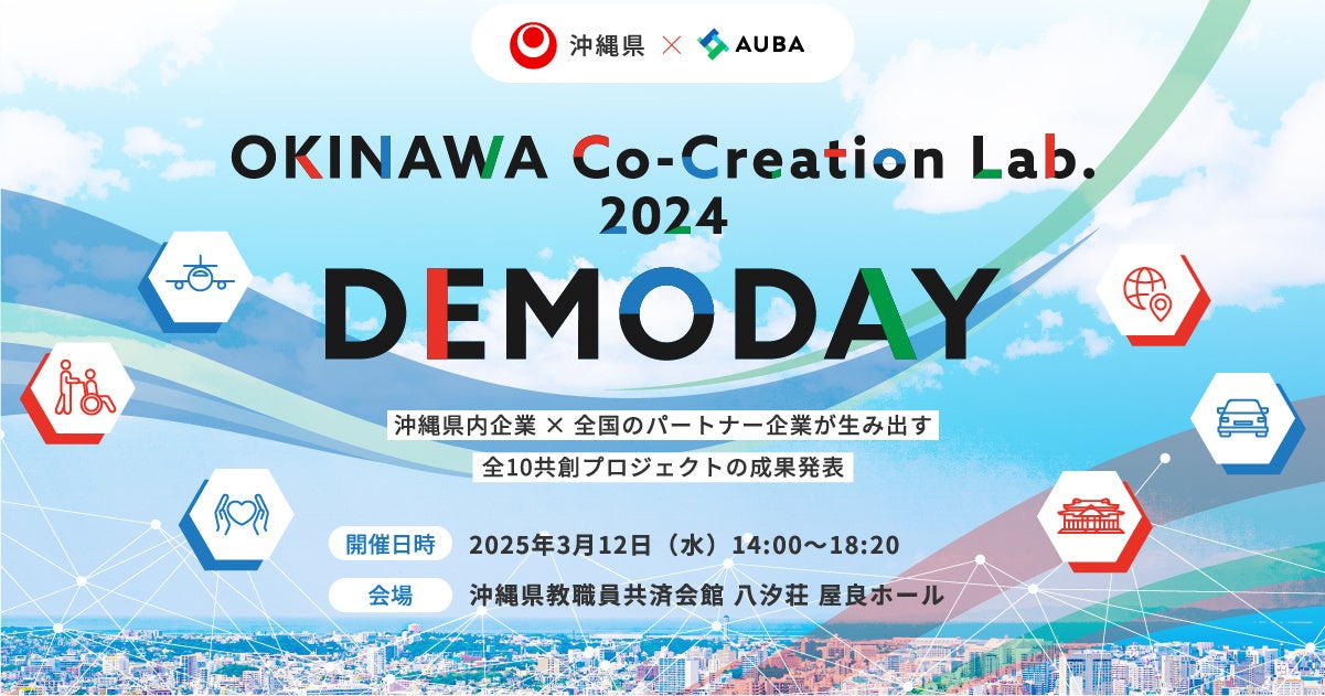 株式会社eiicon(エイコン 本社所在地:東京都文京区後楽、代表取締役社長:中村 亜由子、以下 eiicon)が運営する日本最大級のオープンイノベーションプラットフォーム「AUBA(アウバ)」は、沖縄県内事業者のオープンイノベーションによる革新的なビジネスやサービスの創出を目的に沖縄県とともに実施している『OKINAWA Co-Creation Lab.2024(オキナワ コー クリエーション ラボ2024、以下 本事業)』において、<協働・共創事業><補助事業>2つの事業で採択のあった計10の共創プロジェクトの成果報告イベント『OKINAWA Co-Creation Lab.2024 DEMODAY(以下、本イベント)』を、2025年3月12日(水)沖縄県教職員共済会館 八汐荘 屋良ホール(那覇市)にて開催することをお知らせします。