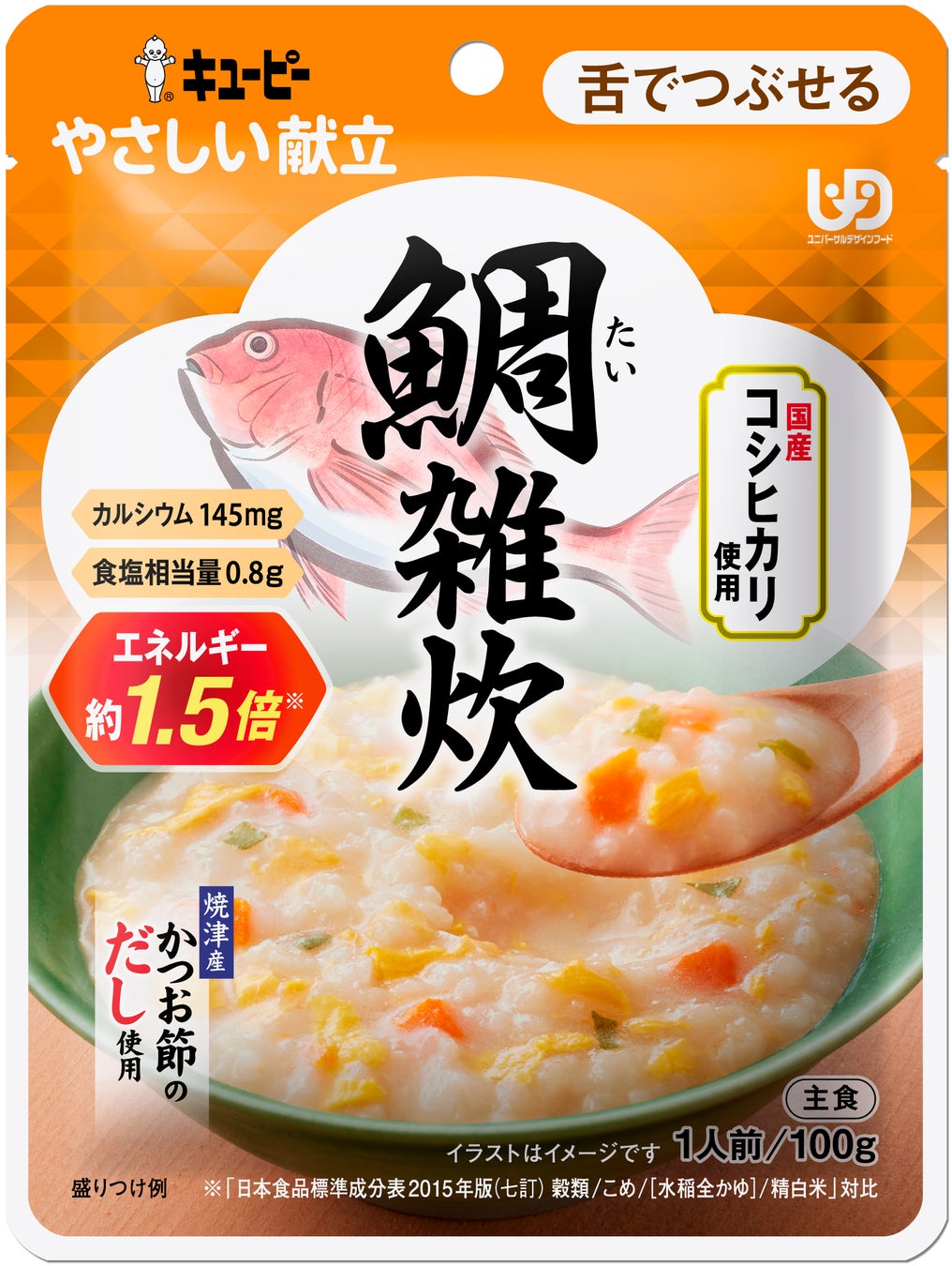 鯛だしと焼津産かつお節のだしをベースに、鯛や魚介のうま味が引き立つ一品です。UDFの「舌でつぶせる」に区分され、一般的なおかゆの約1.5倍※5のエネルギーが摂取できる仕立てになっています。賞味期間は19カ月(常温)です。