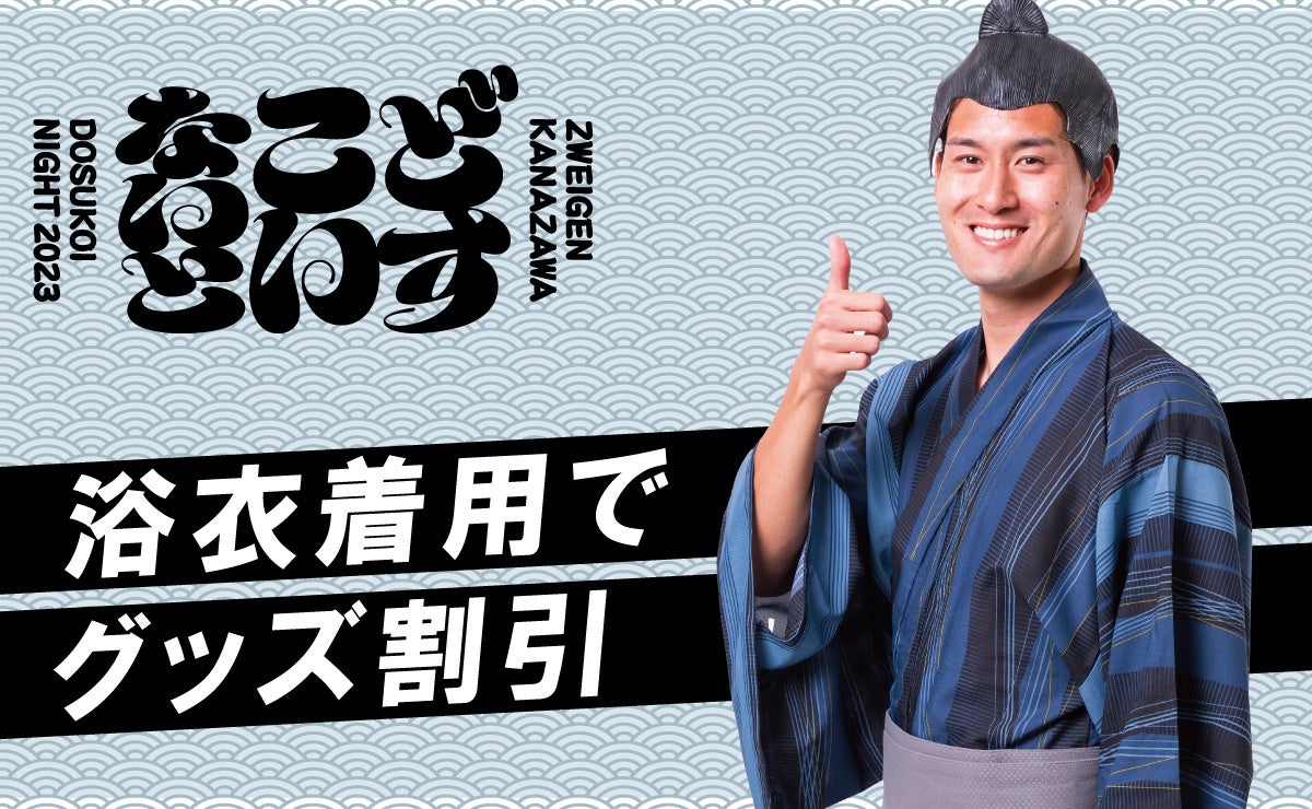 浴衣または甚平姿でぜひご来場ください!グッズショップで5,000円(税込)以上お買い上げいただいお客様は、お会計から1,000円を割引!