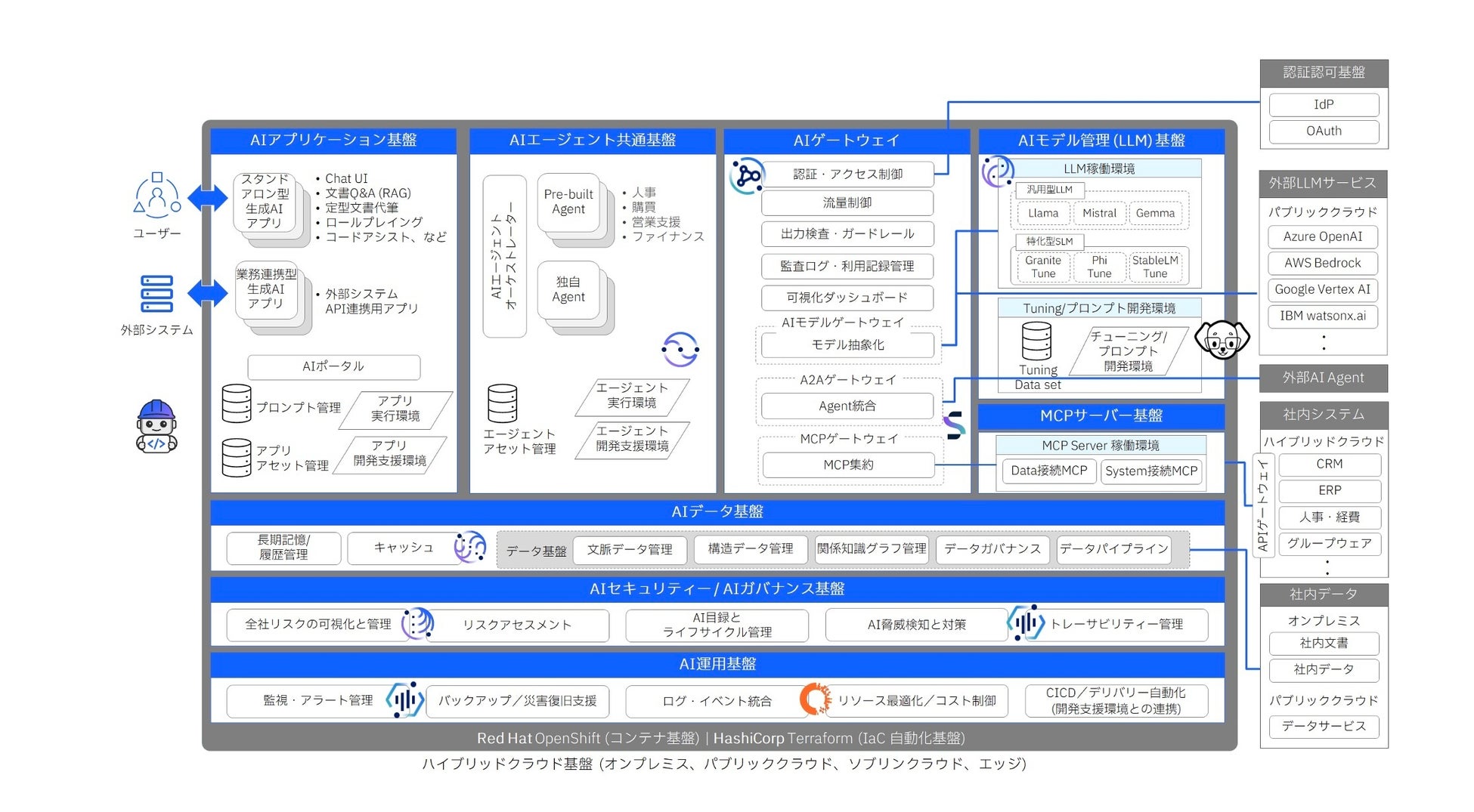 情報漏えいや不適切な回答などを防ぐため、高度な「AIガードレール」を基盤全体に実装します。AIガバナンス・プラットフォームのIBM watsonx.governanceやAIゲートウェイなどを活用し、AIの挙動を常に可視化・制御することで、ガバナンス体制構築の実現を目指します。