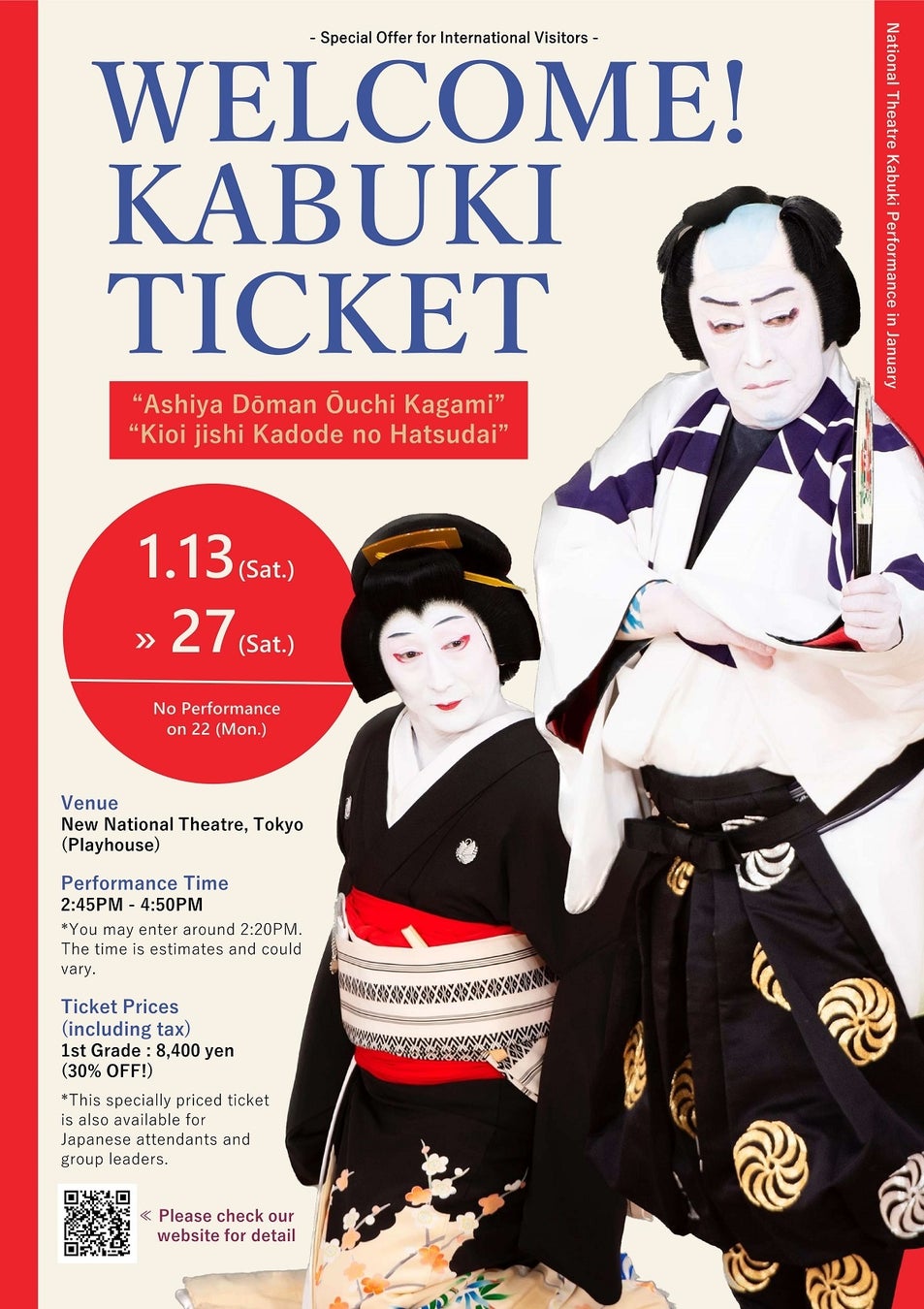 国立劇場では、外国人のお客様向けに、初春歌舞伎公演を途中からご覧いただける特別プラン「WELCOME!KABUKI TICKET」をご用意いたしました。短時間・お得な価格設定で歌舞伎をお楽しみいただけます。