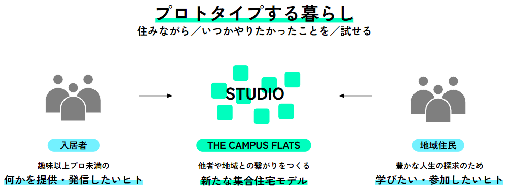 「THE CAMPUS FLATS」とは、『プロトタイプする暮らし』をコンセプトに据えた、コクヨ初の集合住宅ブランドです。人生100年時代の到来で、副業や学び直しなど、自己実現のために時間を使う方が増えています。「THE CAMPUS FLATS」ではそうした方々のニーズに応えるべく、数々のオフィスや店舗の空間デザインで培ってきたコクヨのノウハウを活かし、住みながら、いつかやってみたかったことを、試せる集合住宅を展開します。