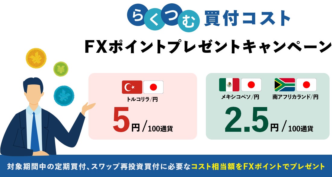 条件を満たしたお客様に、キャンペーン期間中の定期買付およびスワップポイント再投資による買付コスト相当額をFXポイントにて進呈いたします。