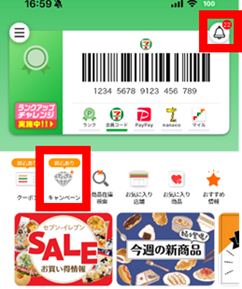 ①アプリ画面の「お知らせ」または「キャンペーン」をタップし、抽選画面に進む