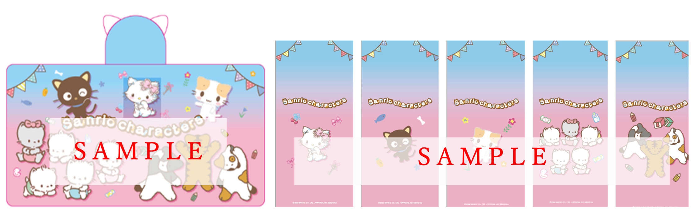 「チャーミーキティ」、「チョコキャット」などのネコのキャラクターが大集合した、特別感たっぷりのブランケット。猫耳付きのフードは、猫好きさんにぴったりです。