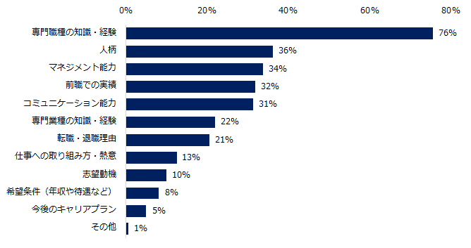 転職コンサルタントに「ミドルの面接において、企業が重視している点」について上位3つを伺うと、トップ3は「専門職種の知識・経験」(76%)、「人柄」(36%)、「マネジメント能力」(34%)でした。続いて、どんな人柄を重視するか伺うと「適応力」が65%がトップでした。企業が重視している点について、具体的なコメントも紹介します。