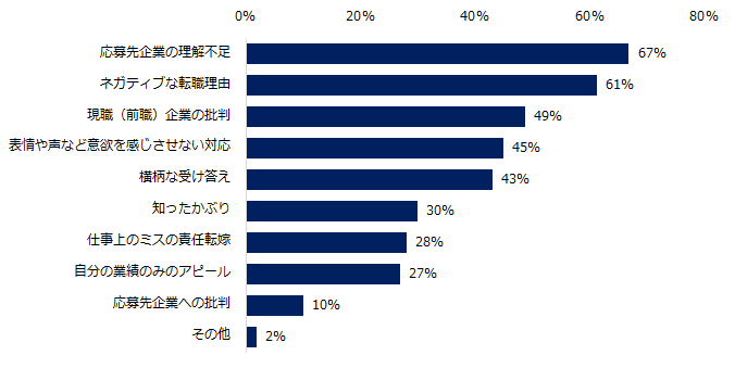 Q.「ミドルの面接において、求職者がやってしまいがちな悪印象を与える行動」について、具体的な理由やエピソードを教えてください。