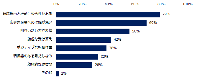 転職コンサルタントに、ミドルの面接で面接官に好印象を与える求職者の行動を伺うと、トップは「転職理由と行動に整合性がある」(79%)でした。続いて、面接での高評価が及ぼす、内定獲得以外の好影響について伺うと「給与額の交渉がしやすくなる」(61%)が最多でした。ミドルの求職者で、面接官からの評判が良い方の特徴やエピソードも紹介します。
