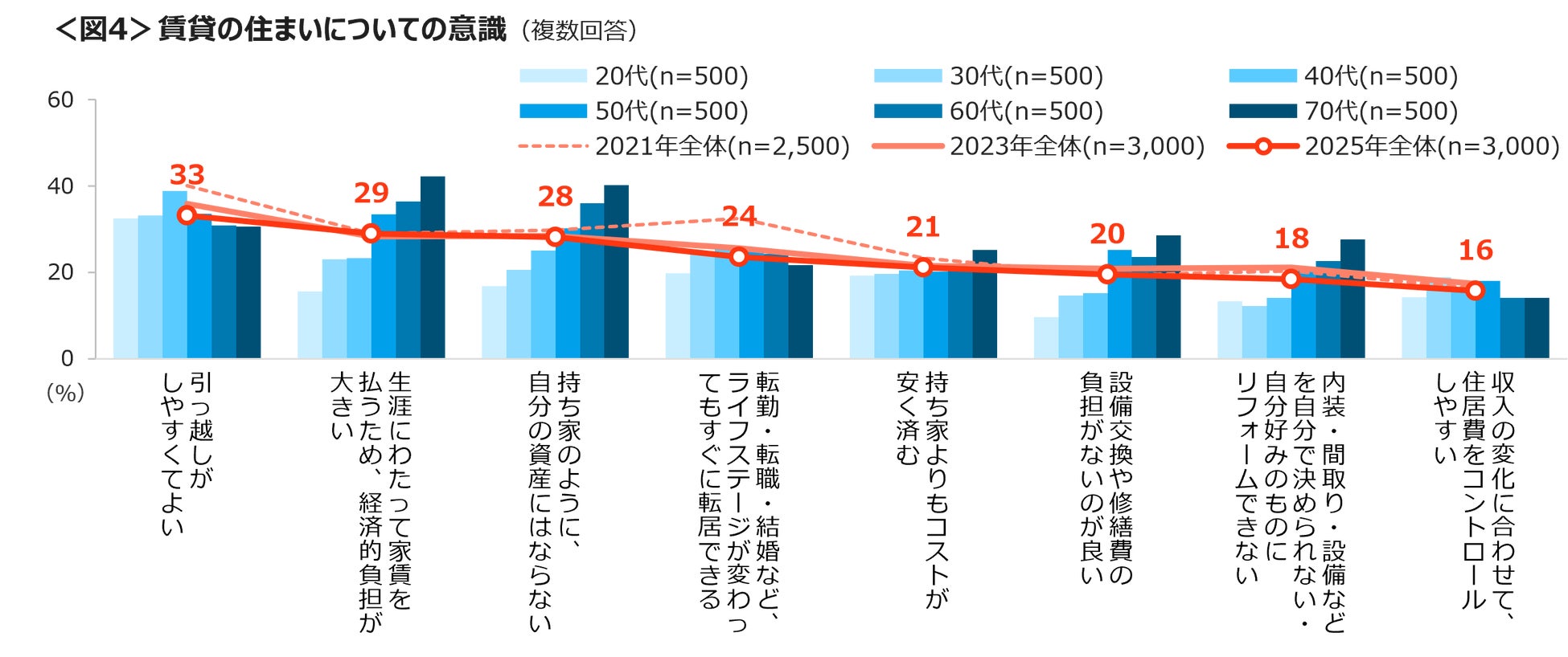 賃貸については「引っ越しがしやすくてよい」が33%であった。年代が上がるほど、経済的負担が大きい、自分の資産にならない、リフォームできないといった項目が高まる傾向にある。<図4>