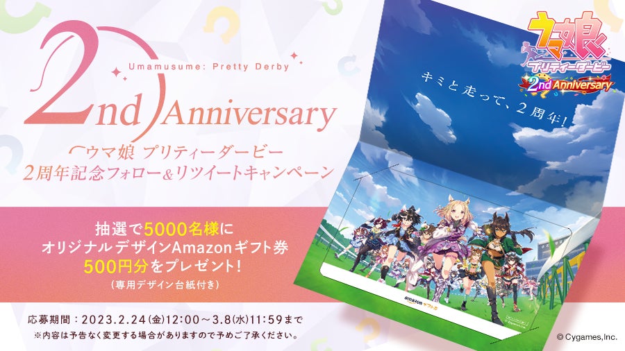 本日2月24日(金)12:00~3月8日(水)11:59まで、「ウマ娘」公式Twitterでフォロー&リツイートキャンペーンを開催中です。抽選で5000名様に、2周年のキービジュアルを使用したAmazonギフト券500円分が当たりますので、ふるってご参加ください。