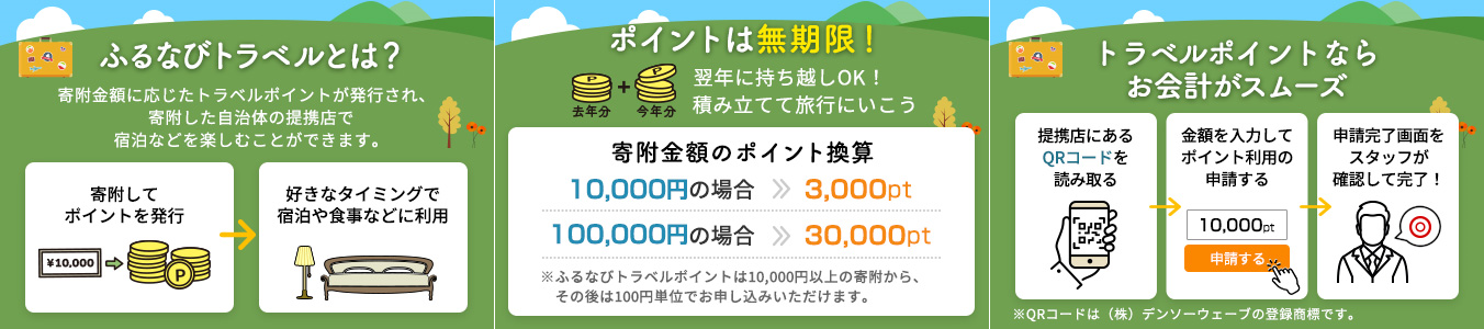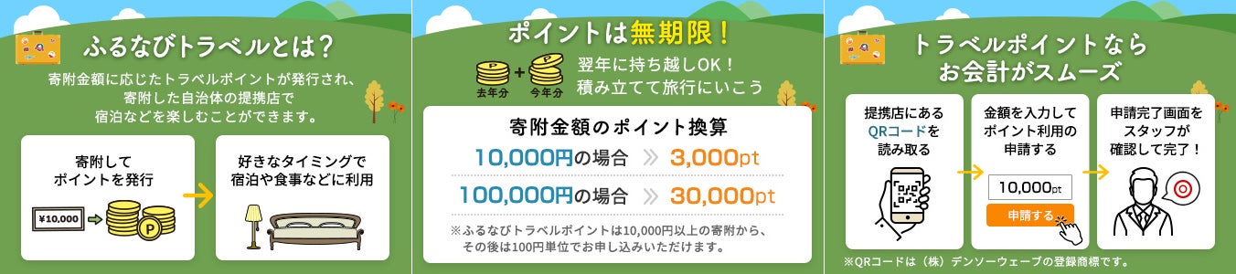 「ふるなびトラベル」は、ふるさと納税先にある提携店(ホテル・飲食店など)で無期限にご利用可能な電子ポイント(ふるなびトラベルポイント)を、返礼品として受け取れるサービスです。ふるなびトラベルポイントは、寄附後に即時アカウントに付与されます。