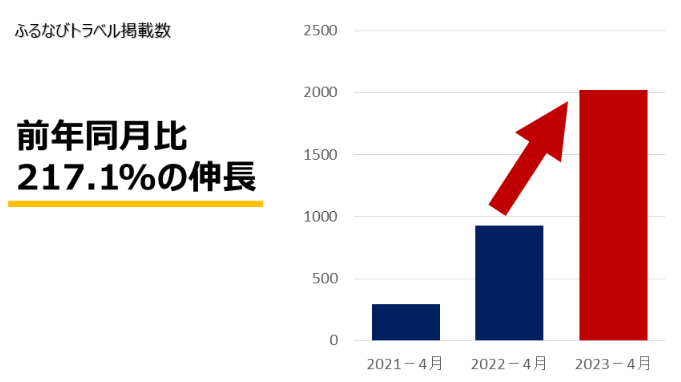 株式会社アイモバイル( 本社:東京都渋谷区、代表取締役社長:野口哲也、東証プライム市場 )は、運営するふるさと納税サイト「ふるなび」( https://furunavi.jp )が展開する旅行体験型の独自返礼品「ふるなびトラベル」( https://tp.furunavi.jp )において、2023年4月5日付で提携店が前年同月比217.1%に増加し、2,019施設に達しました。