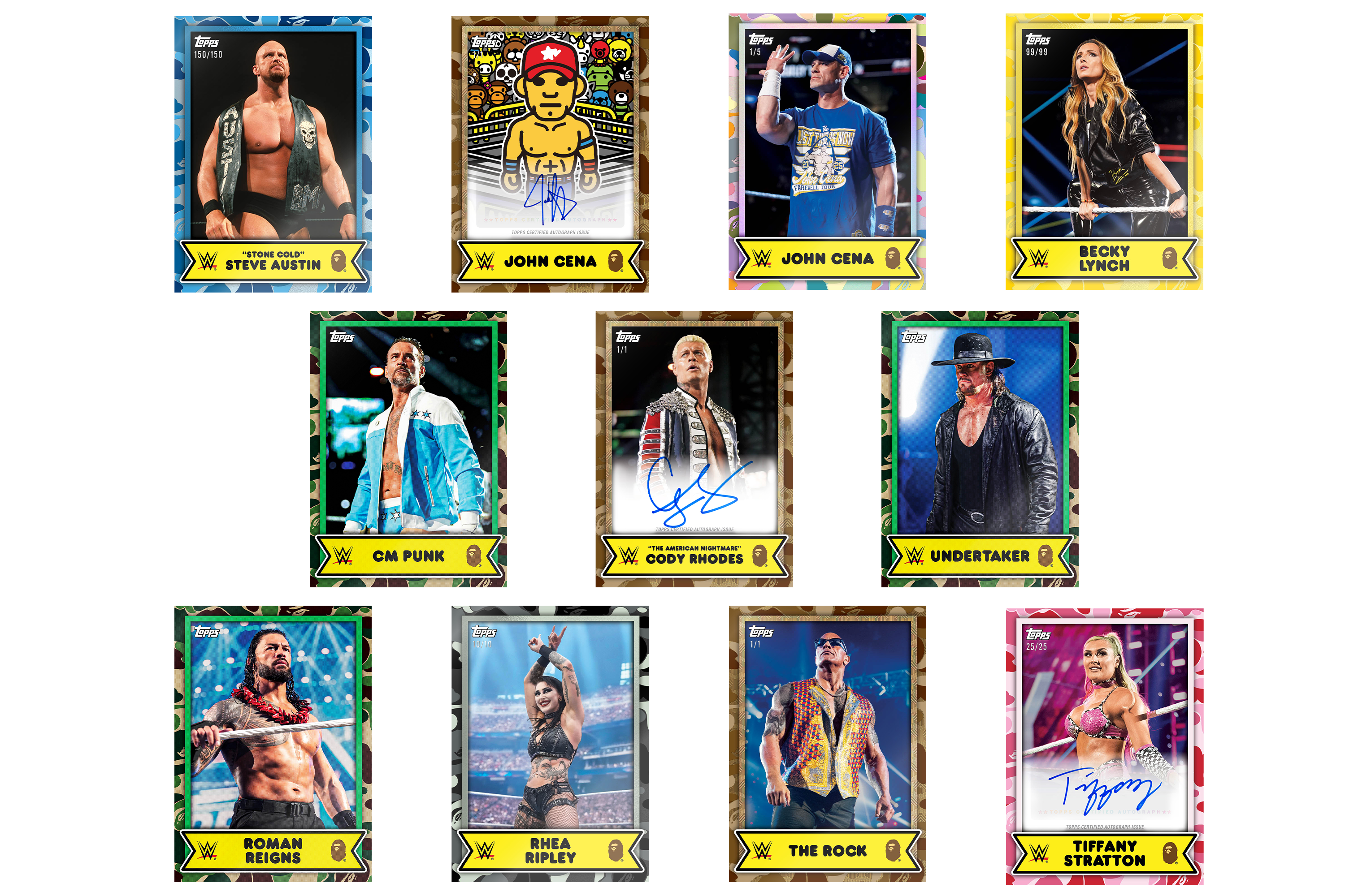 各ボックスには、プレミアムカード5枚(ベースカード2枚、パラレル2枚、BAPE®限定インサート1枚)を封入。さらに、お気に入りのスーパースターの直筆サインが入っている可能性も。トレーディングカードは2025年11月28日(金)よりBAPE.COMおよび Topps.com にて受注発売となります。