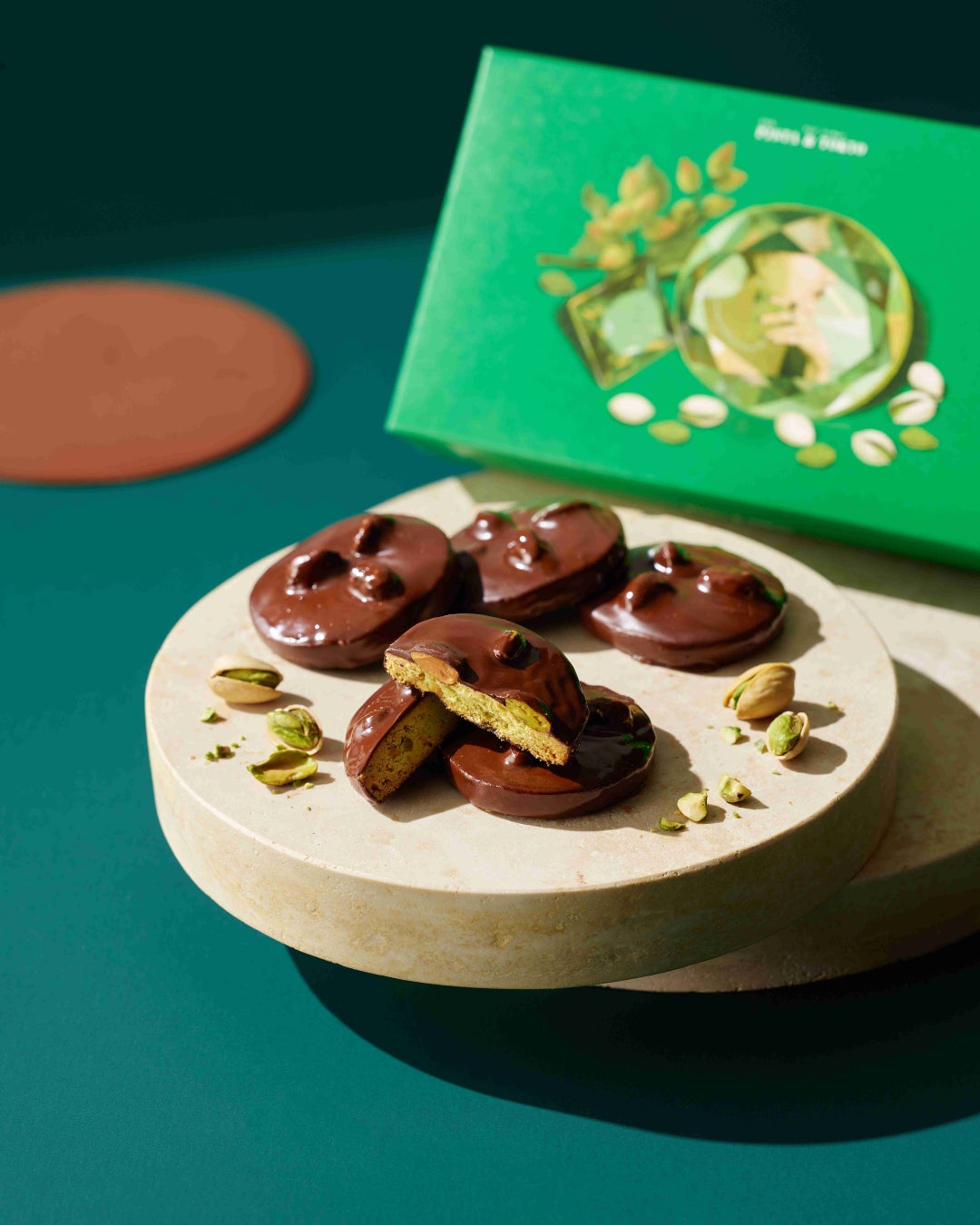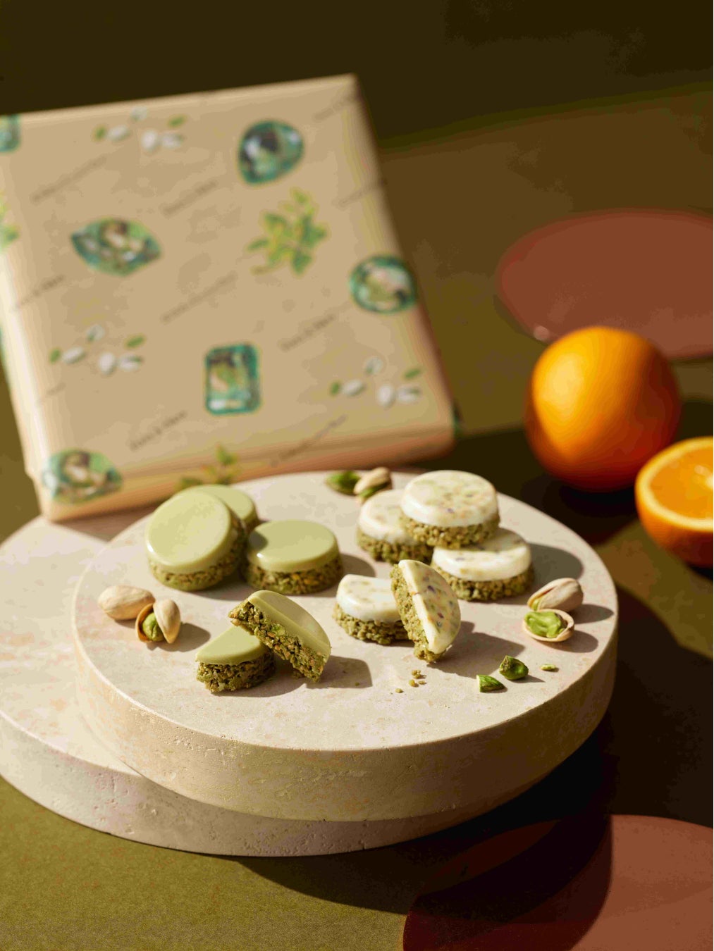 香ばしくサックリとした歯ざわりの良い食感で仕上げたピスタチオサブレに、ゴロっとしたピスタチオを飾りスイートチョコレートで包み込みました。ショコラとサブレの一体感がこの時期ならではの組み合わせです。