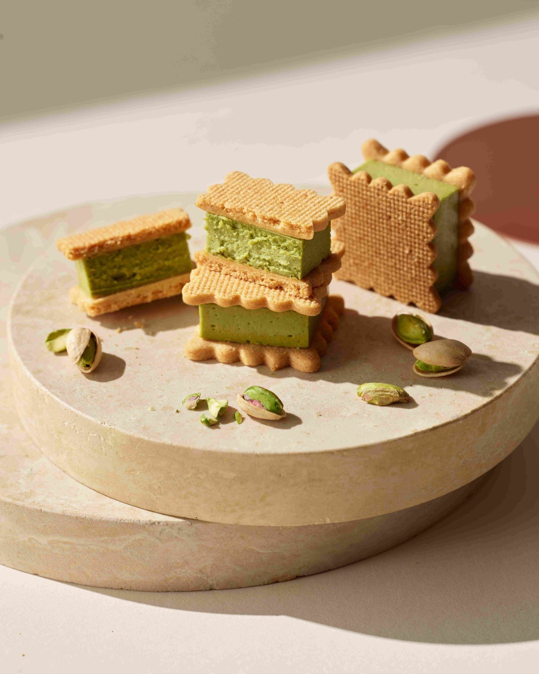 香ばしくしっとりとしたサブレにローストピスタチオペーストとピスタチオプラリネをブレンドしコクを引き出し、オーストラリア産クリームチーズと焼き上げたベイクドチーズケーキをサンド。可愛いらしいサイズ感です。