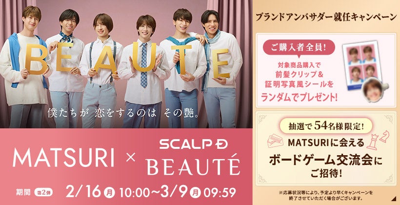 この度、MATSURIのアンバサダー就任を記念して特典が必ずついてくる「【第2弾】MATSURI×スカルプD ボーテ ブランドアンバサダー就任記念キャンペーン」を開催いたします。第2弾キャンペーンでは、対象商品をご購入いただいた方全員に「オリジナル前髪クリップ」と「オリジナル証明写真風シール」をランダムでプレゼントいたします。また、本キャンペーンの第1弾、第2弾の両方の対象商品をご購入いただいた方の中から抽選で54名様に、「MATSURIに会えるボードゲーム交流会」にご招待いたします。応募方法の詳細は、キャンペーン特設サイトにてご案内しております。