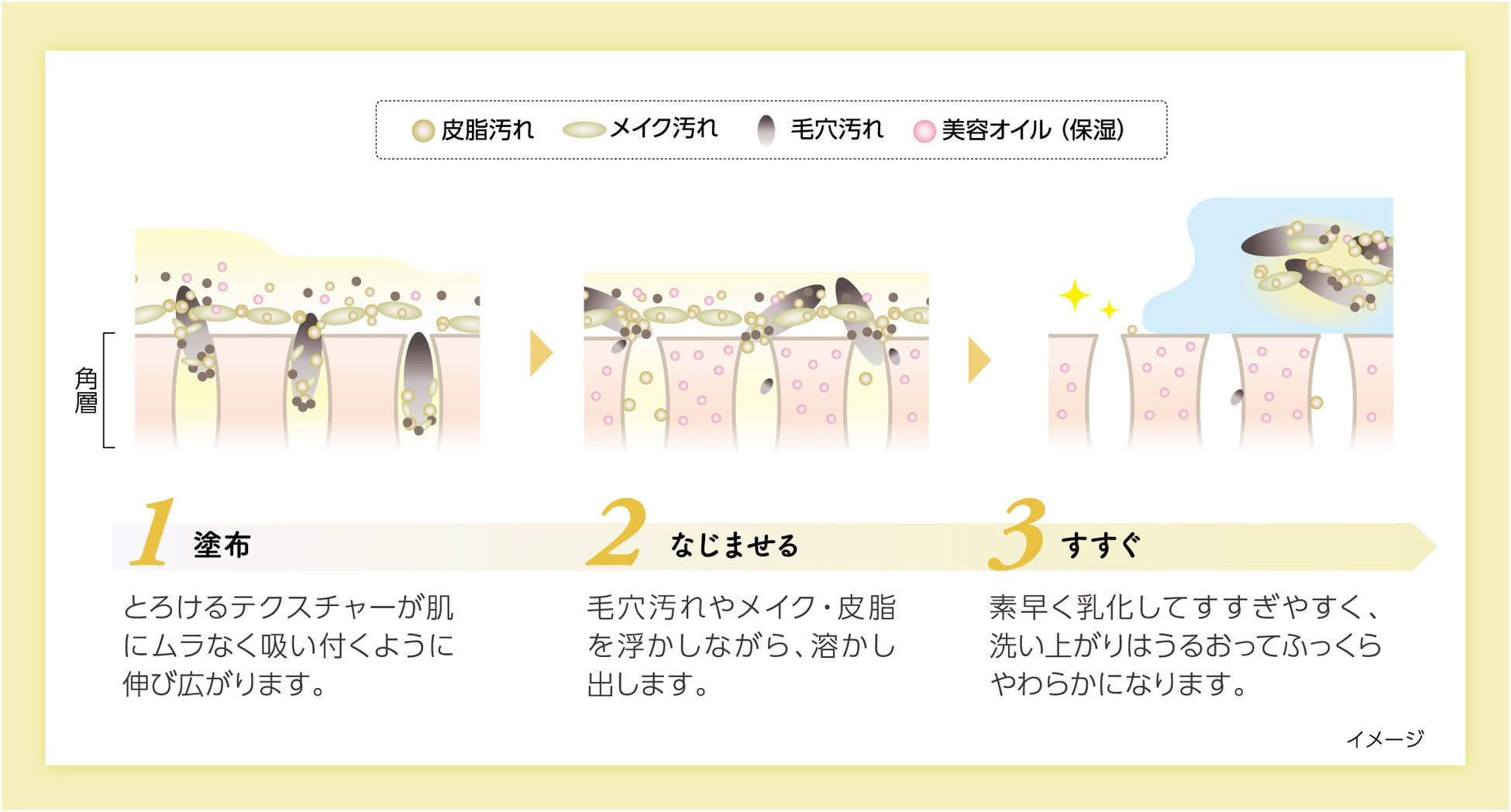 じゅわっととろけながら、肌の凹凸にムラなく伸び広がり密着。心地よく毛穴汚れを吸着します。