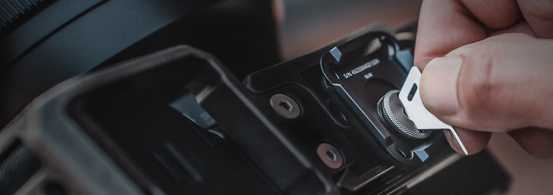標準装備の多機能イジェクトピンは、メモリーカード/SIMカードを簡単に取り外すことができ、その特徴的な形状によりクイックリリースプレート用の簡易的なマイナスドライバーとしても機能します。