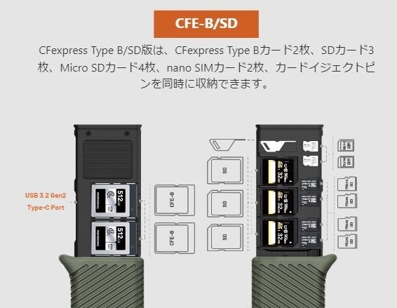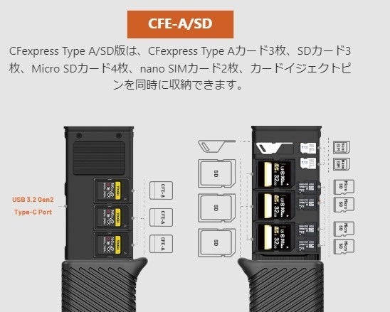 CFexpress Type Aカード×3、SDカード×3、microSDカード×4、nano SIMカード×2、カードイジェクトピンを同時に収納可能。