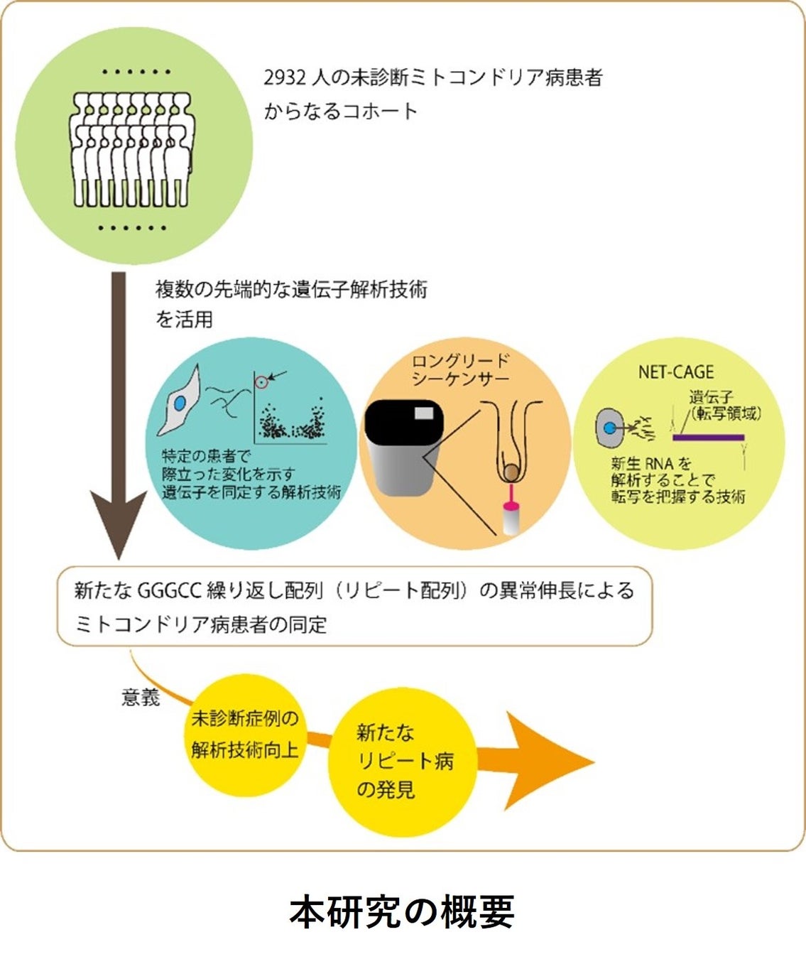 今回、共同研究グループは、ロングリードシーケンサーなど複数の技術を駆使して、ミトコンドリア病の原因となる新たなリピート異常伸長の同定を目指しました。