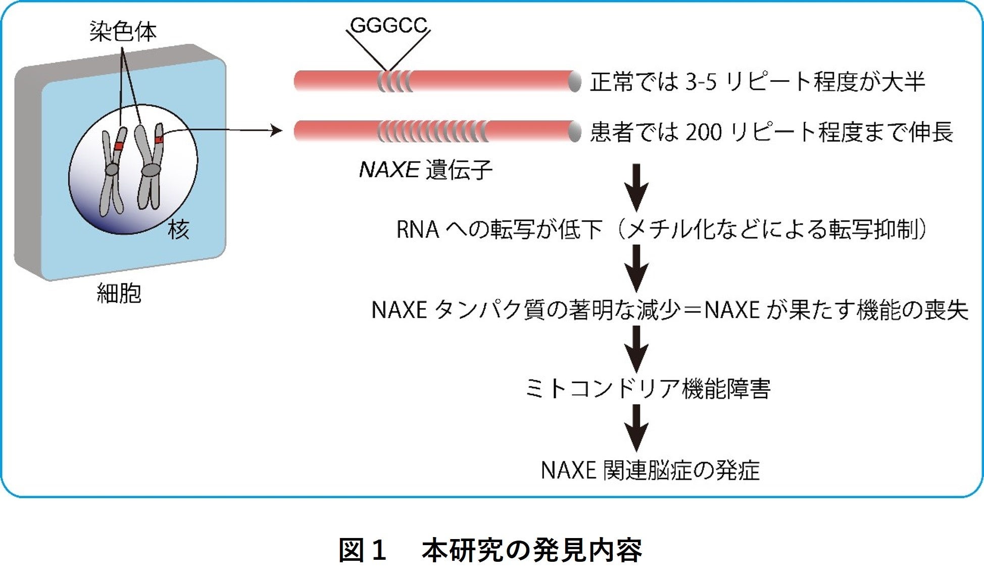 NAXE遺伝子というミトコンドリア病に関連する遺伝子において、GGGCCの5塩基を繰り返し単位として、健常者では3~5回程度の繰り返し配列だった。一方、ミトコンドリア病の患者では200回も病的に伸長した繰り返し配列が同定された。これにより、NAXE遺伝子の発現を制御する領域にゲノムDNAにCpGメチル化の化学的修飾が生じることで遺伝子の発現が抑制され、結果としてNAXE遺伝子の産物であるNAXEタンパク質の著明な減少が起きる。NAXEはミトコンドリア機能に重要なNAD(P)HXと呼ばれる物質の代謝に関わっている。これが障害されることで細胞機能が低下し、NAXE関連脳症を来すと考えられる。