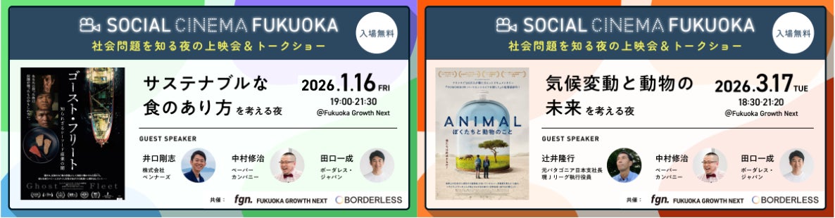 世界14カ国で50以上のソーシャルビジネスを展開する株式会社ボーダレス・ジャパン(本社:福岡県福岡市、代表取締役CEO:田口 一成、以下 ボーダレス・ジャパン)と福岡市の官民共働型スタートアップ支援施設「Fukuoka Growth Next」(所在地:福岡県福岡市、以下FGN)は、全2回にわたり社会問題をテーマにした映画上映会&トークショー「SOCIAL CINEMA FUKUOKA」を2026年1月16日(金)、3月17日(火)に開催することをお知らせします。